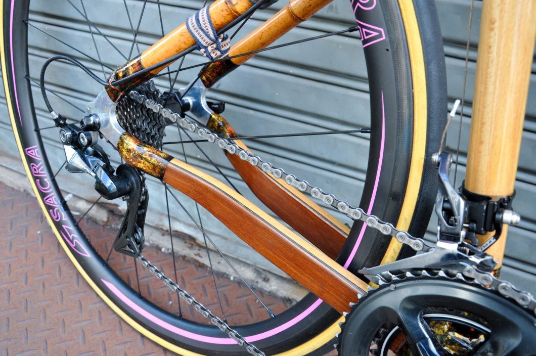 乗る人の好みよって合わせて作ることができますよ。硬めとか柔らかめとか、乗り心地がいい方がいいとか。僕は柔らかめが好きやけどね。全部、竹で作ったら一番柔らかくて乗り心地がいいんですけど、下りで60km/hくらいのスピードでは少しふわふわするので、もう少し硬い方がいいなと思ってチェーンステーには木を使っています。