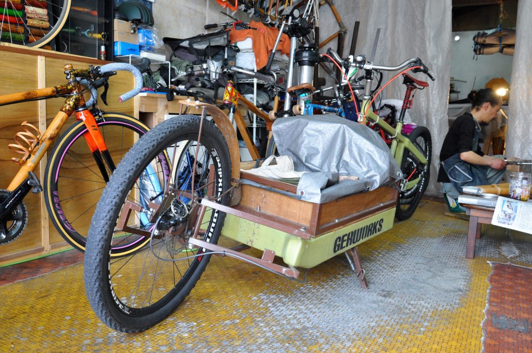 最初は荷物を運ぶためにロングテールの自転車を作っていました。その時は全部、竹で作っていたんですけど、ちょっと柔らかかった。強度は充分だけど柔らかすぎてもう一つだなと思って、それでこの自転車は木で作りました。あとは荷物を載せやすいようにケースをつけて、安定するように重心も低くしています。そのためにフォークも無くしました。フォーク部分のパーツは台湾の自転車の展示会に出たときに紹介してもらったパーツです。これはテストで作ったものですけどね。