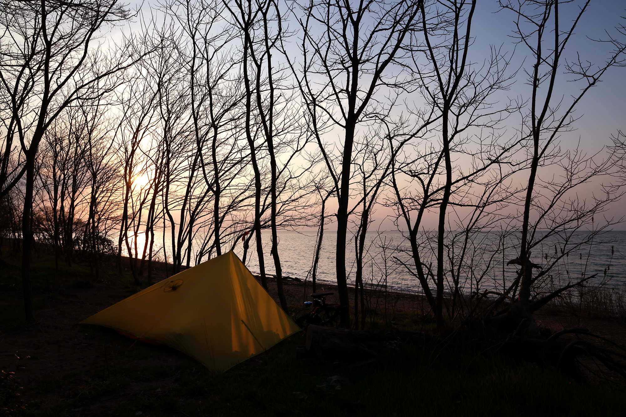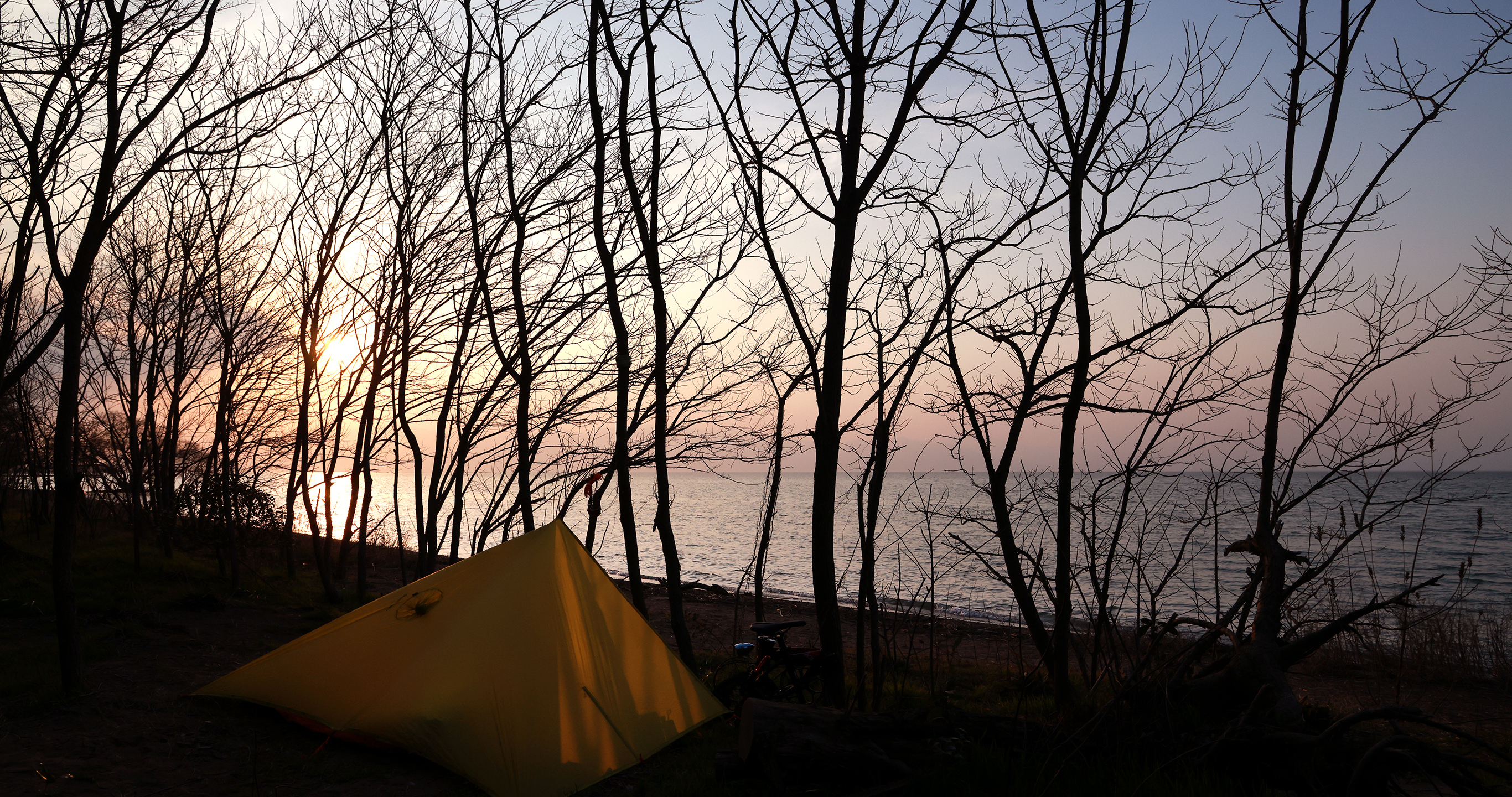 今日の寝床。うーん、この開放感が刺激的(笑)。片面フルオープンのまま、きちんと眠って翌朝を迎えることができるのかが、今回の最大のポイントとなる。風はずっと湖面から吹いている。本来、風上側は閉じたいところだが、風景は犠牲にはできない。