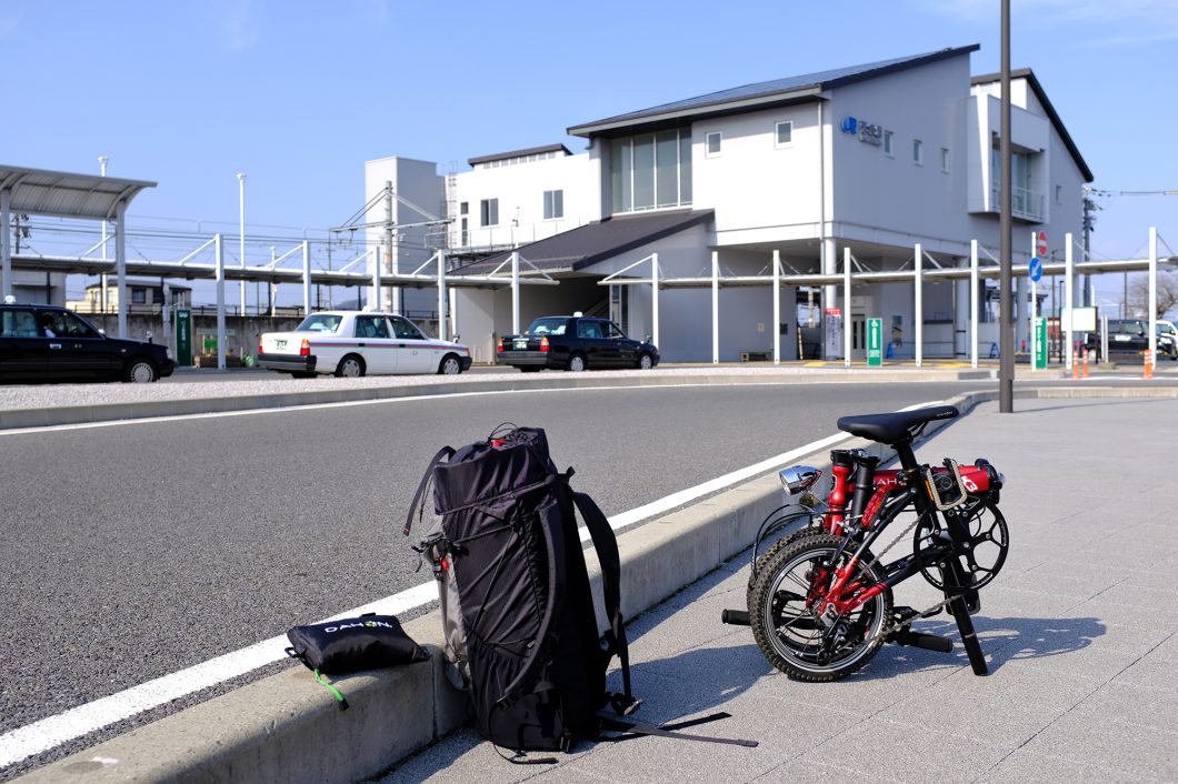 JR 稲枝駅で降りて輪行解除。3月とはいえ最低気温は2℃予報、シュラフ(寝袋)や防寒具でバックパックは大きくなった。