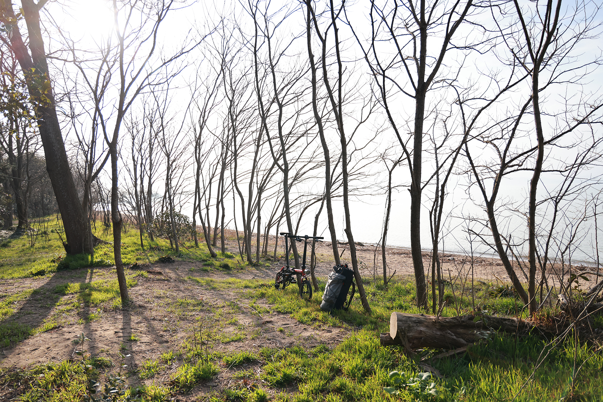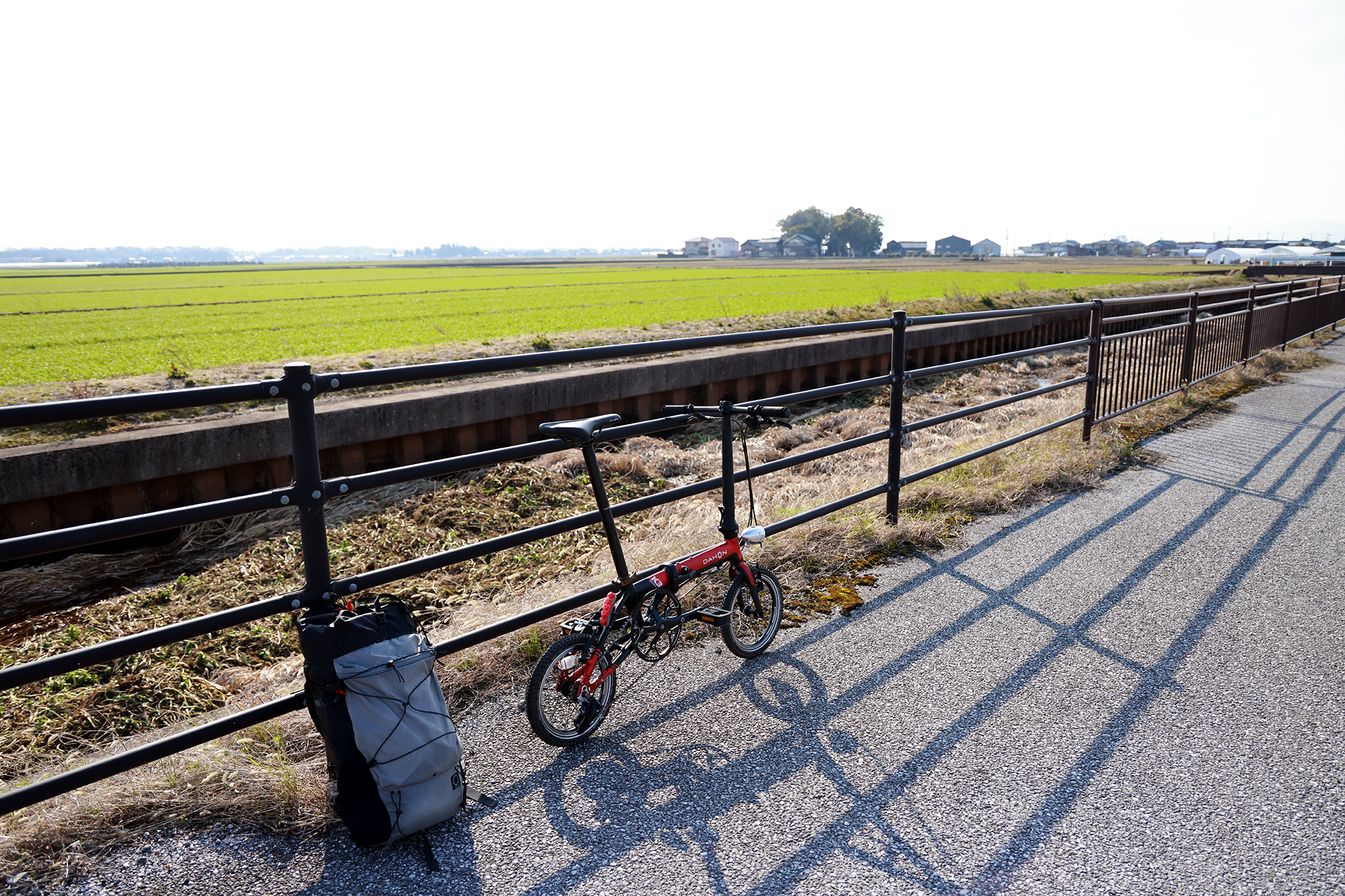 野営地までは距離にして6kmほど。線路をアンダーパスした以外はほぼフラットだった。晴天に恵まれ、田畑の広がる中を走るのが気持ちいい。軽量&コンパクトさと走行性能のバランスがとても良いDAHON K3は、輪行ライド用としては個人的にベストチョイス。