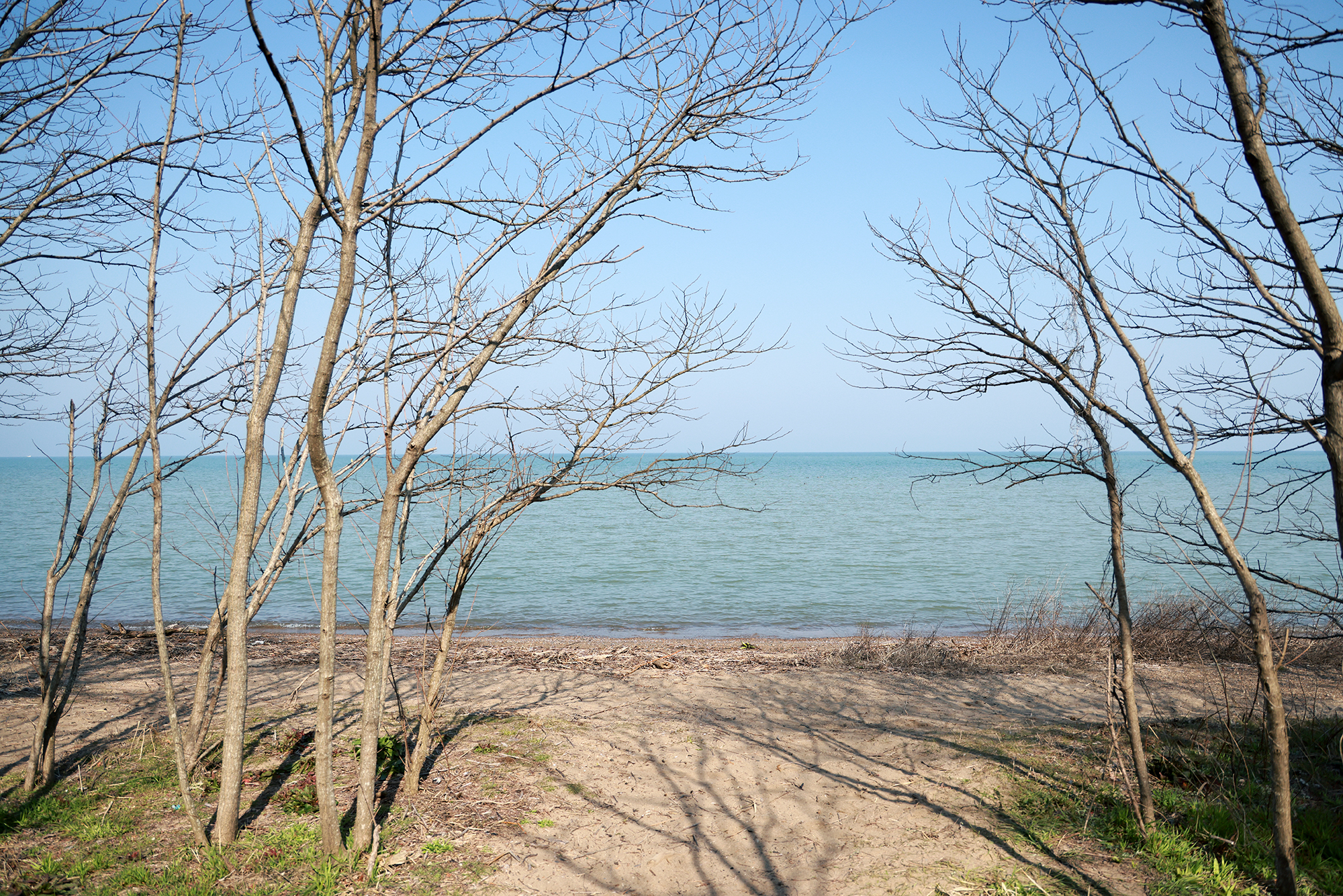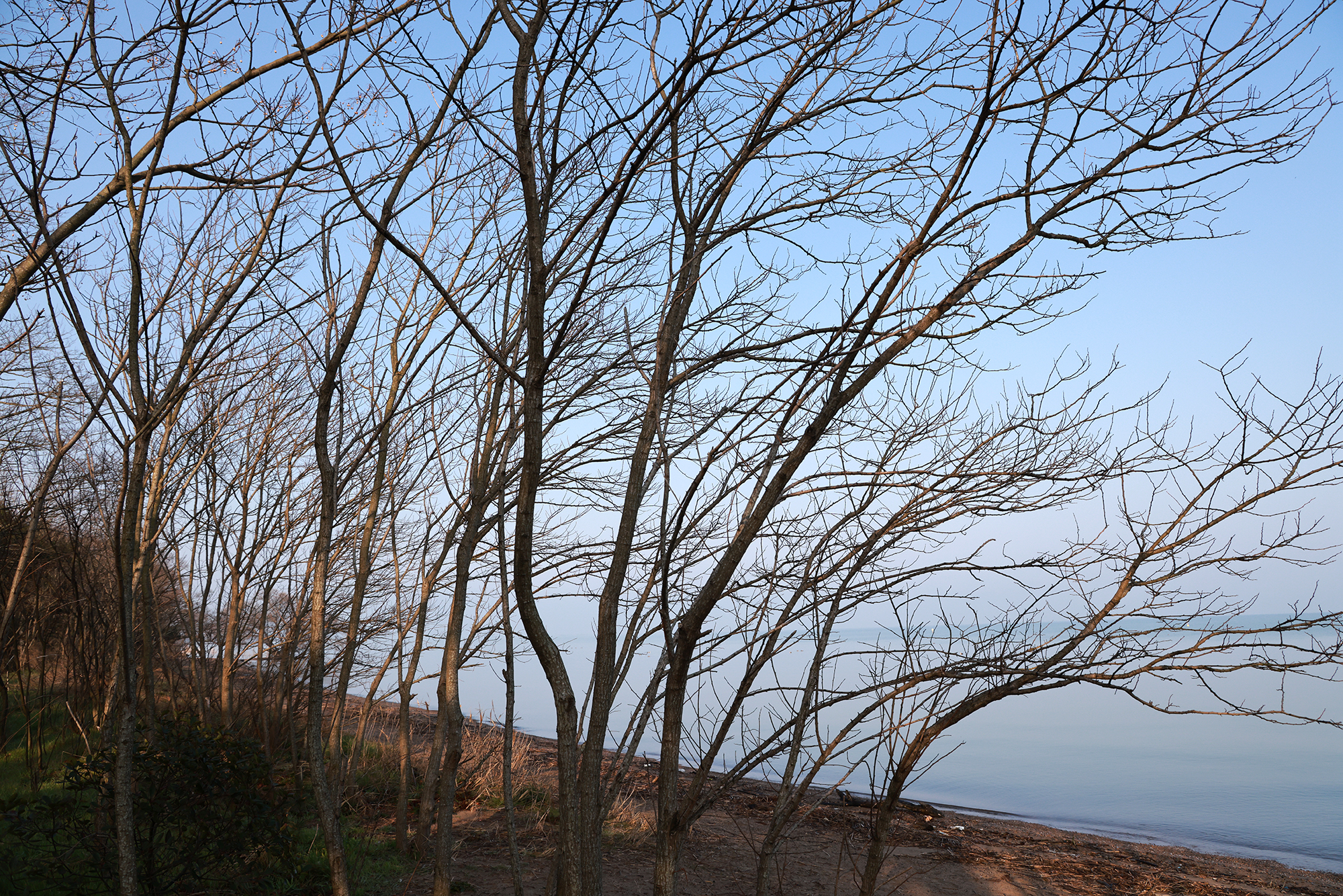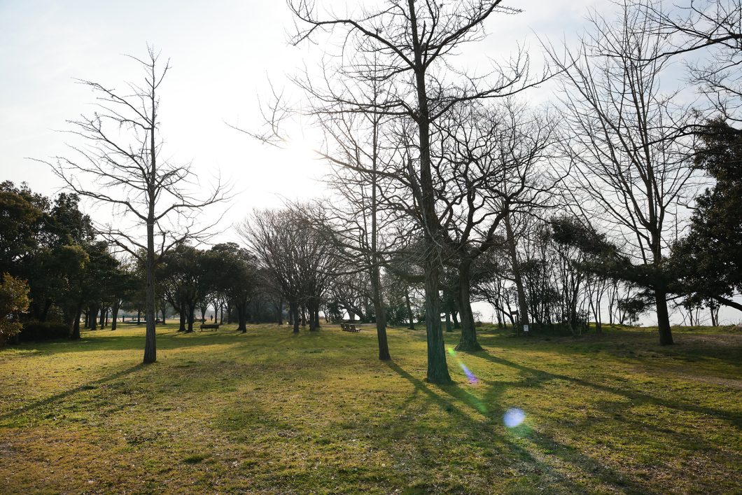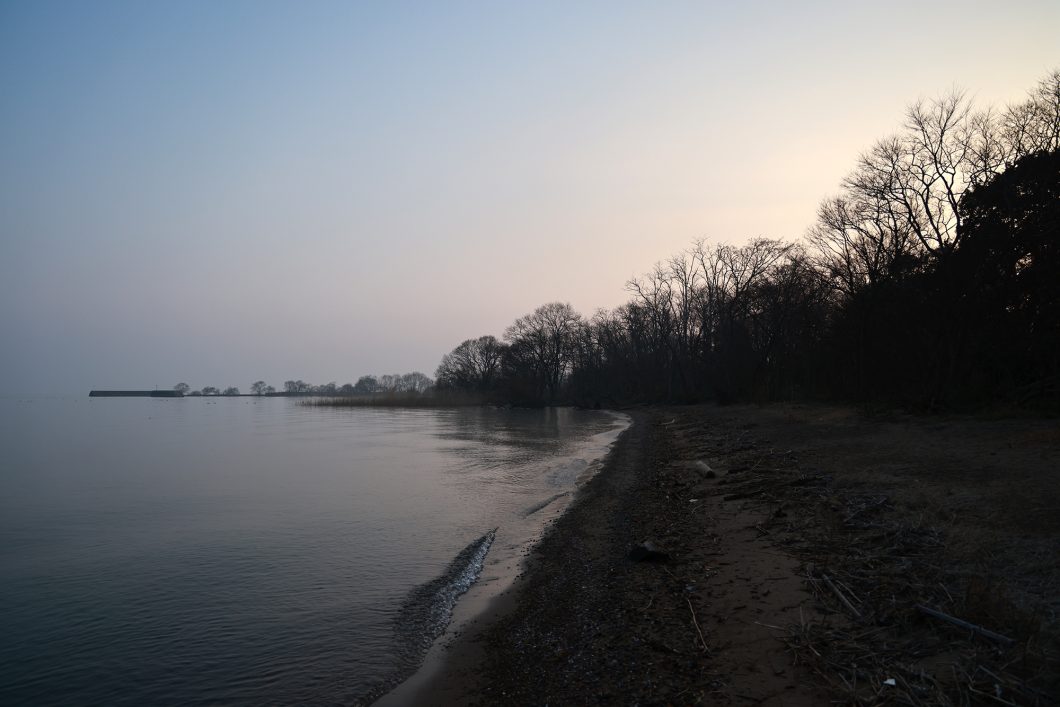 と言ってる間に到着。まだ冬らしい景色で寒々しいが、緑地の先に湖が広がるイメージどおりの場所だ。緑地自体の広さは前回の木浜1よりも少し狭いが、それでもどこにタープを張ろうかと思うくらいの広さがある。