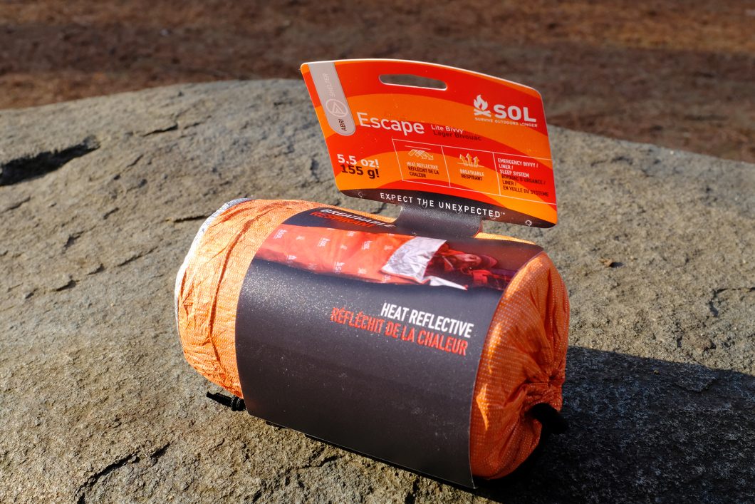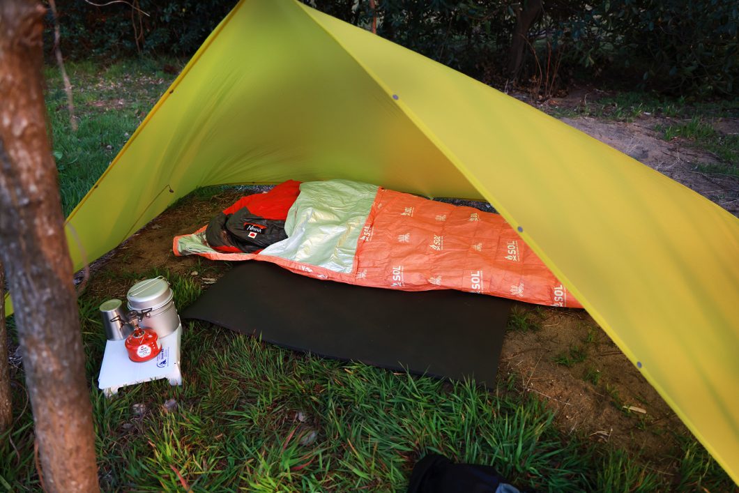 加えて、更なる防寒と、不意の雨や夜露/朝露でシュラフが濡れるのを防ぐシュラフカバーとしてSOLのEscape Lite Bivvyを用意した。本来は登山での不意のビバークへの備えとして念のために持っていくもので、これ1枚で使うことが多いようだ。このSOLのラインナップには、右サイドにジッパーが付きマチのあるマミー型のEscape Bivvyと、よりシンプルな封筒型でマチもジッパーもないEscape Lite Bivvyがあり、軽さ優先で前者228gに対して146g(いずれも袋除く)とより軽い「Lite」の方を購入した。