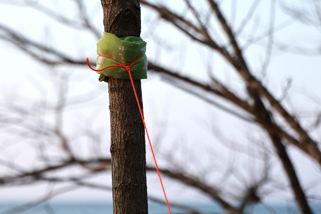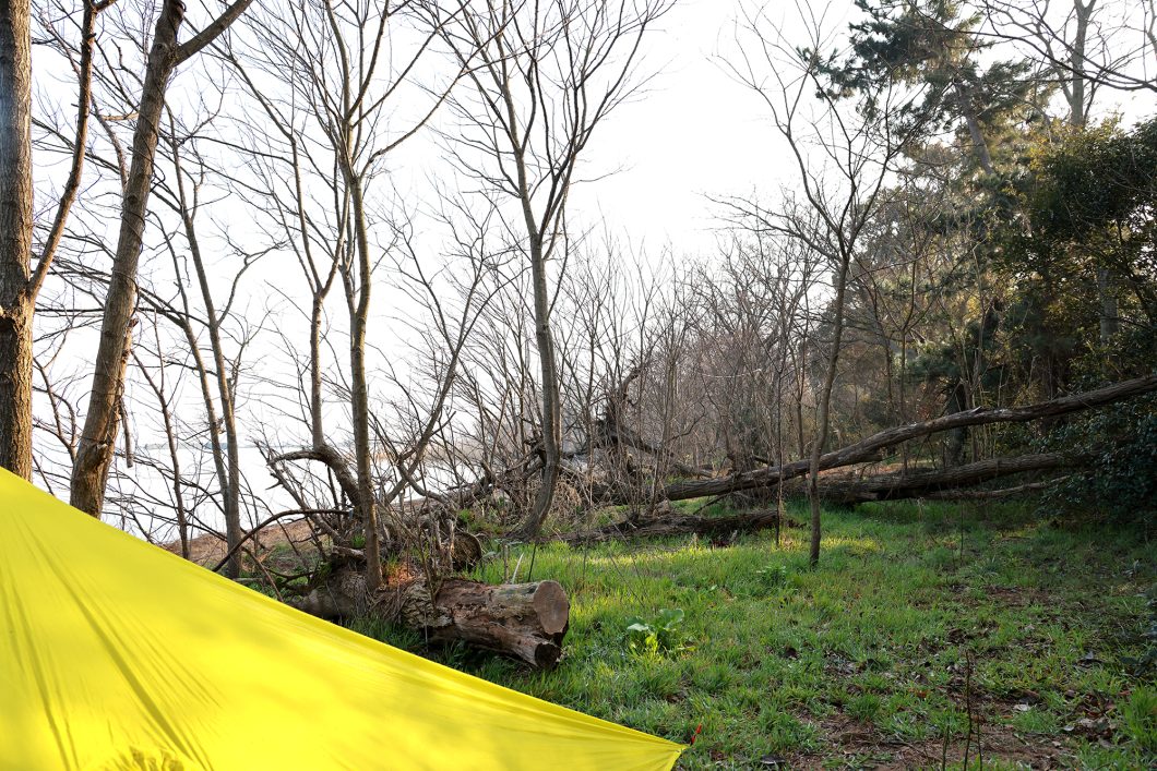 さて、設営。今回ももちろん、テント代わりにポンチョをタープ状に立てるスタイル。支柱は用意しなかった(できなかった)。「山道具 谷ノ木舎」で重さを全く感じさせないカーボン製の支柱に触れてしまい、1万円ほどするので購入を躊躇したまま今日に至るのだ。で結局、木の幹からロープで吊り下げることにした。