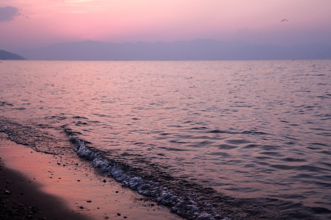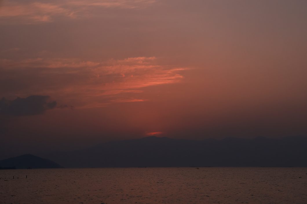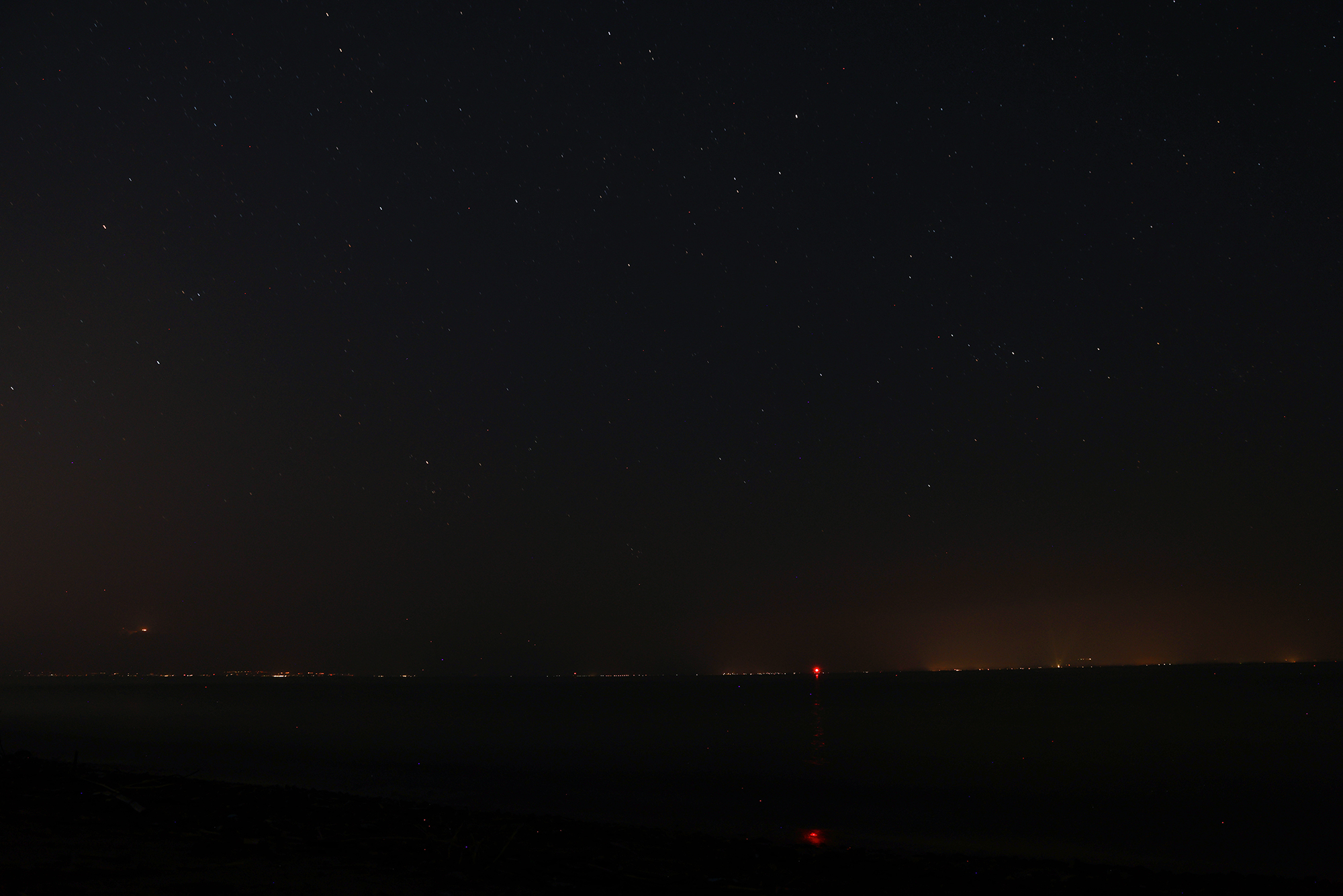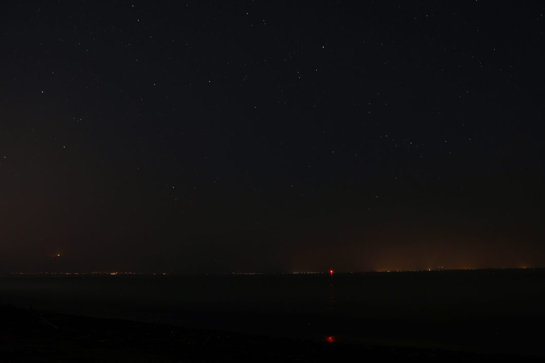 食後、夜景を撮ってみた。三脚は重いため持ってきておらず、波打ち際にカメラを直置きして撮影。流木でレンズに角度をつけて、遠い対岸と夜空が入るようにした。ピントは予めマニュアルで固定しておき、シャッターボタンを押す際のブレ防止にタイマーを利用した。ゆくゆくはバルブ撮影などもしてみたい。