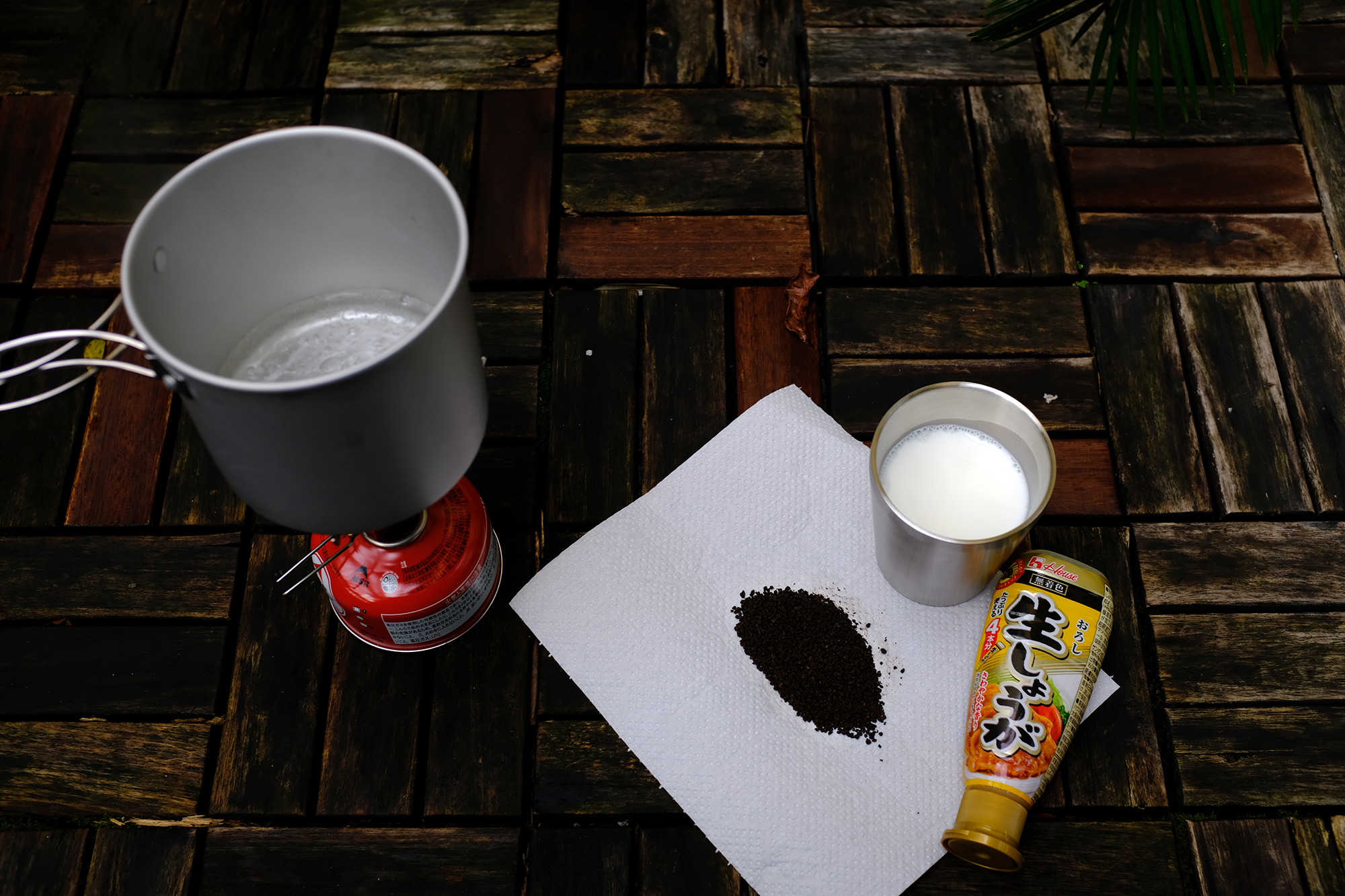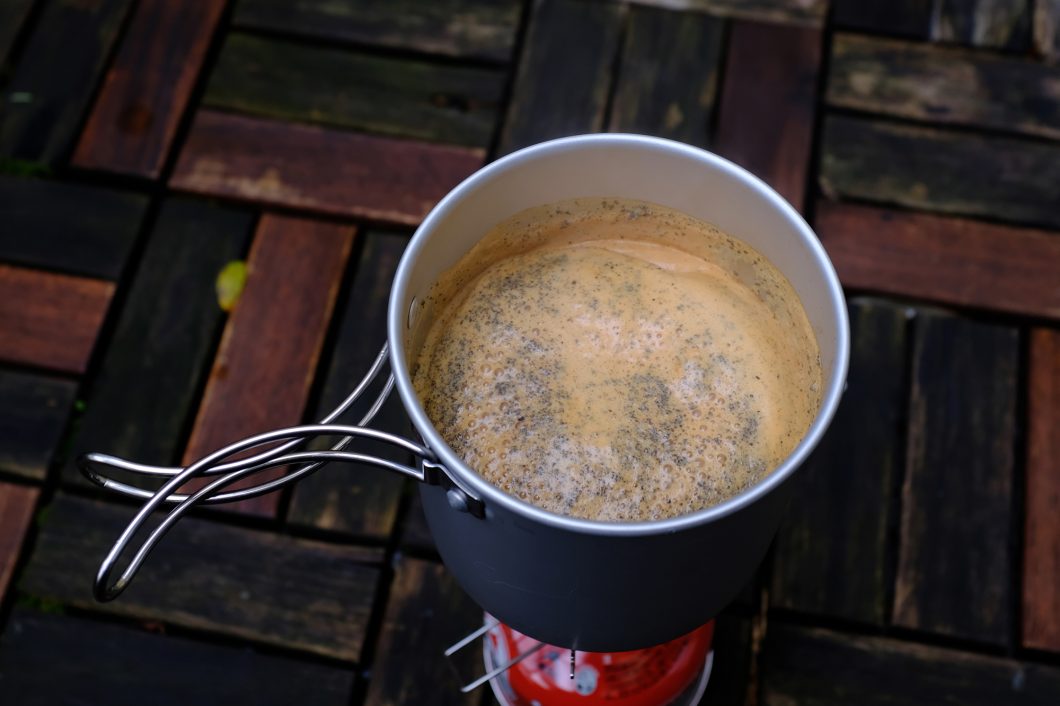 ちなみに、シングルバーナーとクッカーの組み合わせでチャイをうまく淹れられるか、事前に自宅でテストしていたので、その時の様子をご紹介。茶葉はアッサムをスプーンで押しつけて細かく砕いたもの。