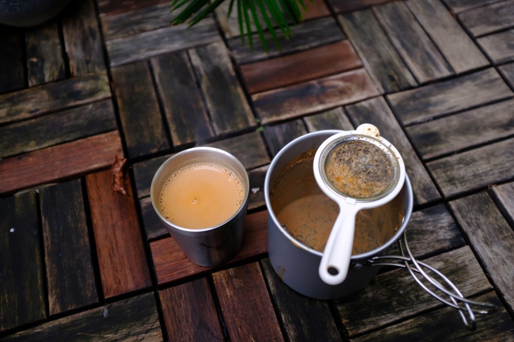 基本的には牛乳で茶葉を煮出すだけなので、キャンプでチャイを淹れるのは難しくないだろう。沸騰した牛乳が何度も吹きこぼれそうになるのを経て美味しいチャイが出来上がる。