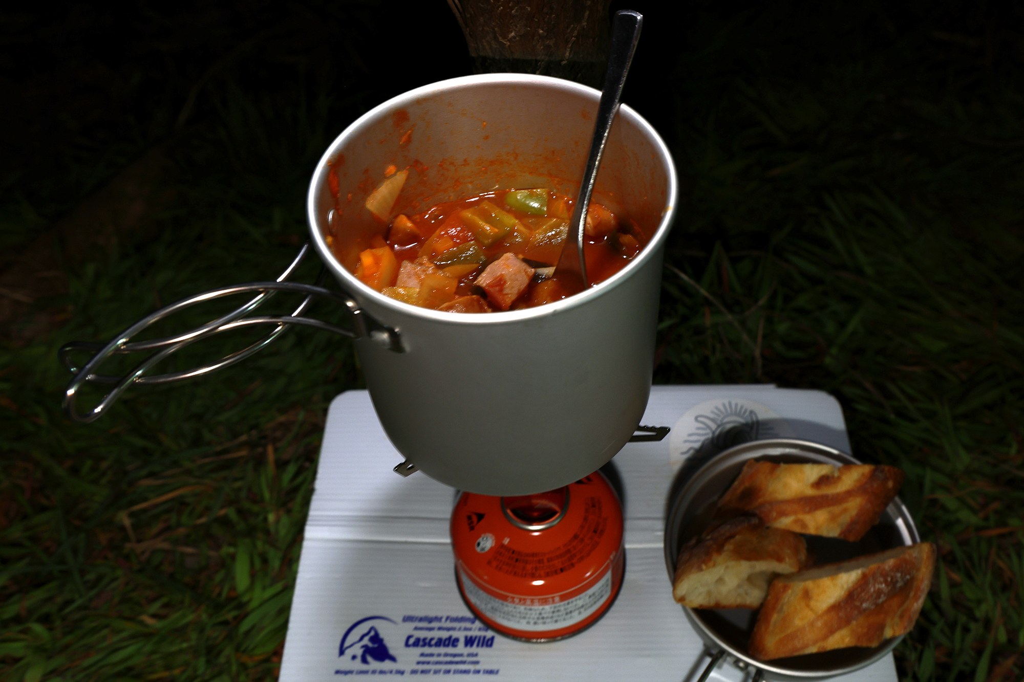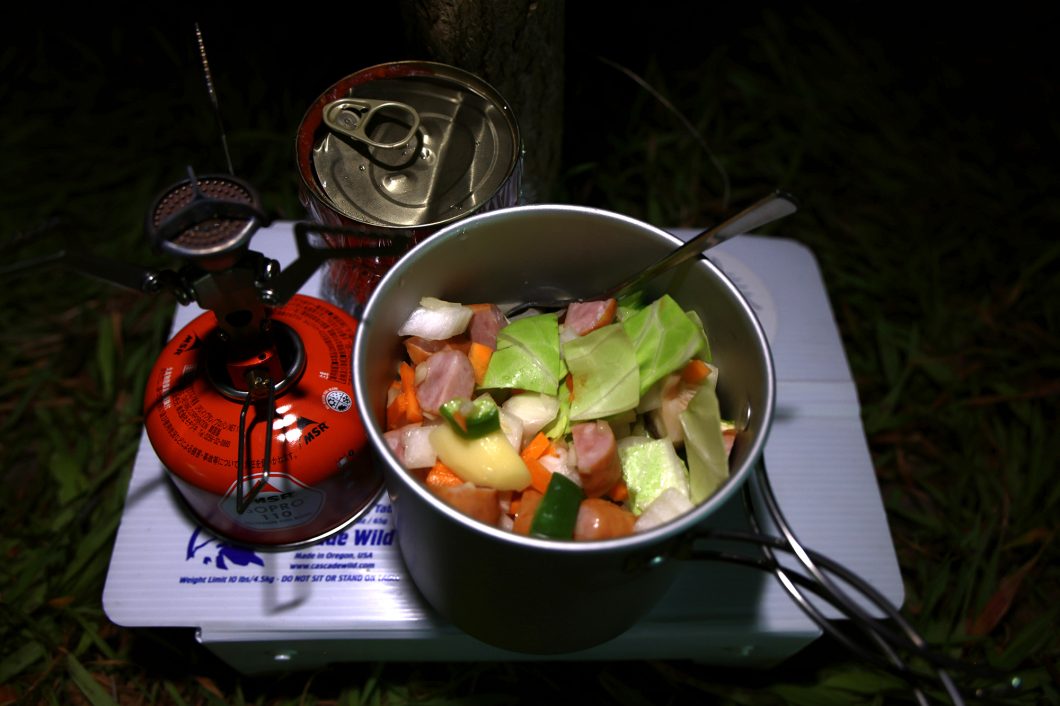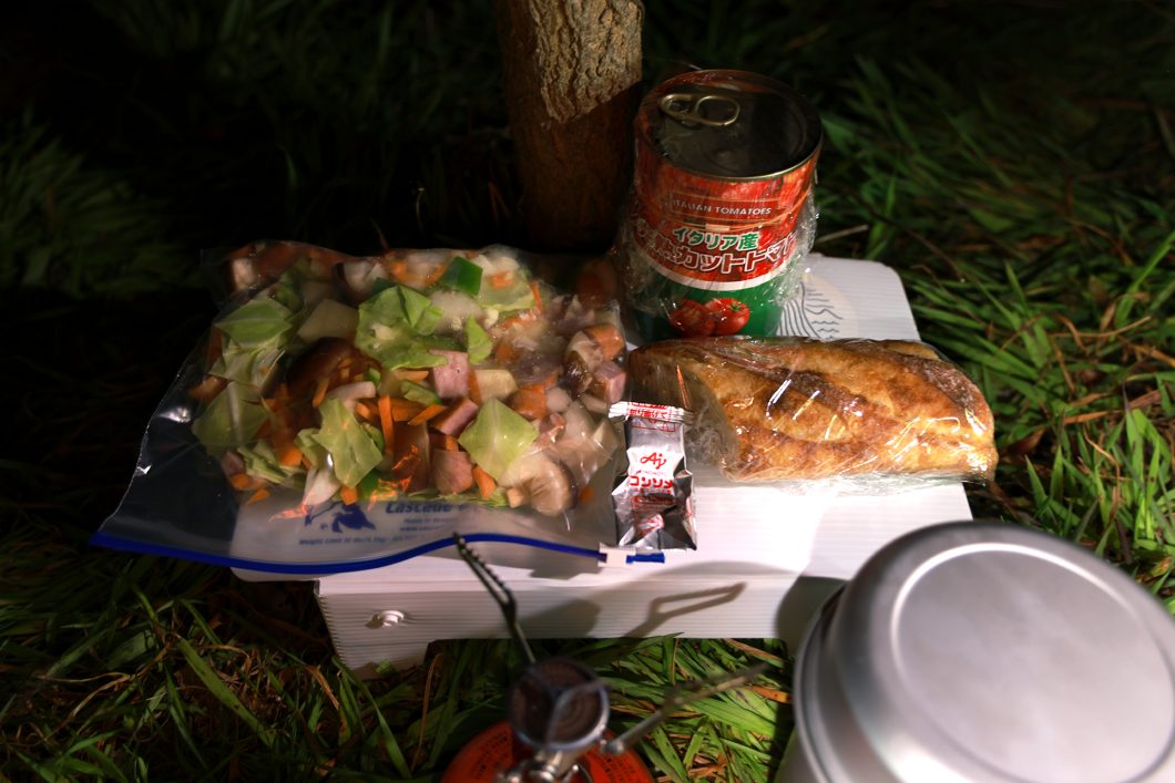 材料はこちら。ウインナー、玉ねぎ、人参、じゃがいも、椎茸、ピーマン、キャベツ、トマト缶、ニンニク、コンソメ、塩コショウ(とバケット)。必要量だけ予め自宅で準備し、現地ではクッカーで加熱するだけにしておいた。