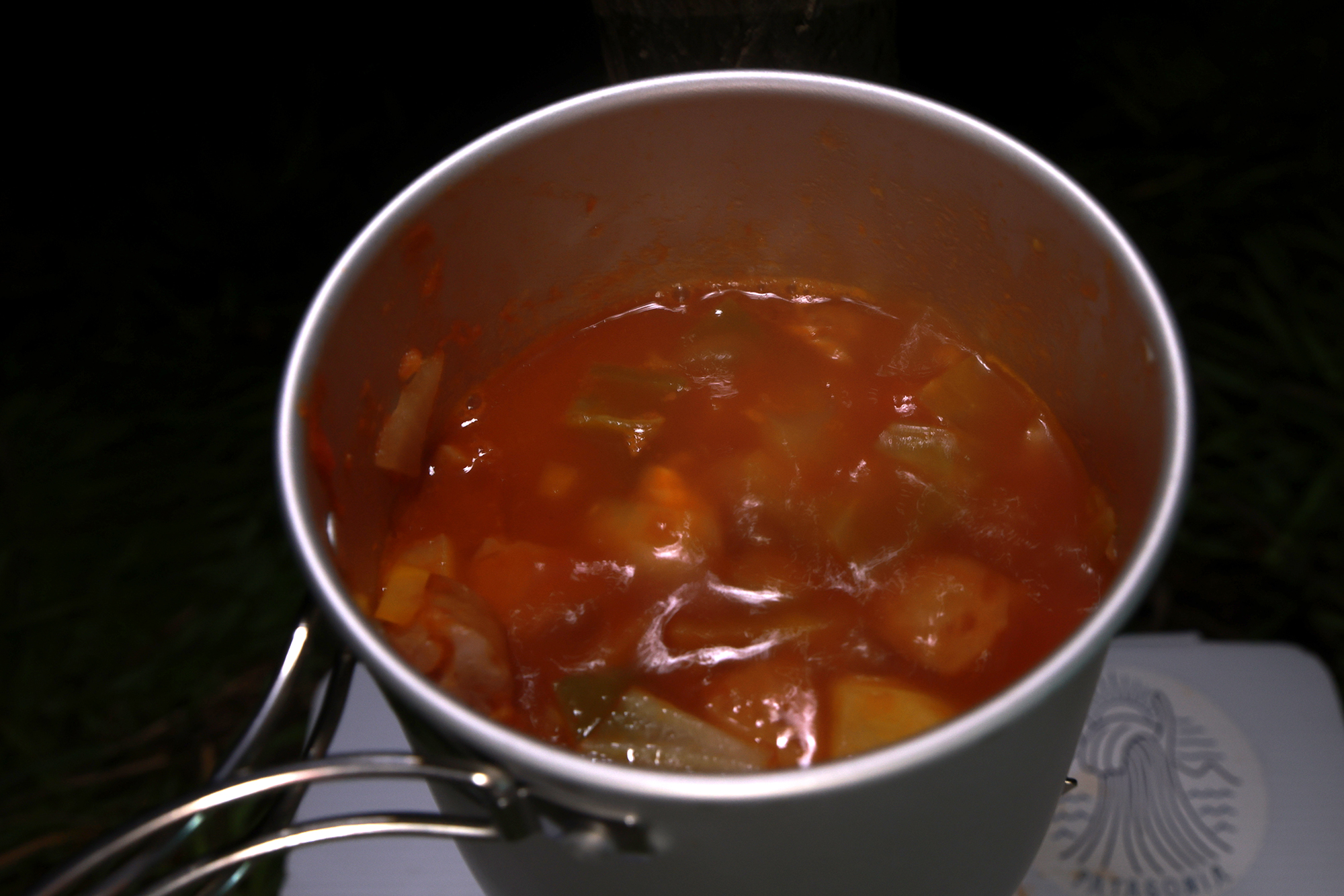 それでは夕食にしますか。今日の献立はイタリアの野菜スープ「ミネストローネ(のビギナー向け簡単版)」。身体が温まるもの、料理初心者でも失敗せずに作れるもの、クッカーひとつで作れるもの、という条件から決めた。
