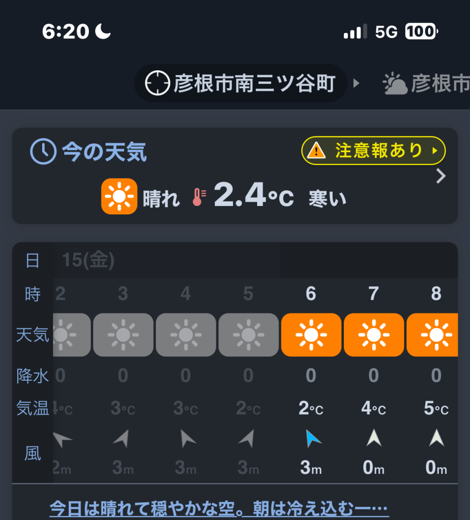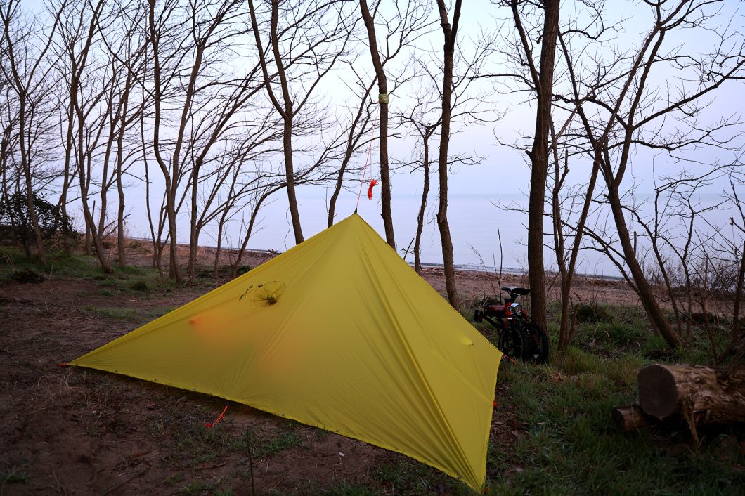 2時ごろ、寒くて目が覚めた。相変わらず波の音がうるさい。寝ながらにして星が綺麗に見える。顔が冷たい。首元から冷気がシュラフの中に入り全身を冷やしているように思ったので、シュラフを完全に閉じて(シュラフの中に顔も埋めて)外気が一切入らないようにした。その後4時ごろ、6時ごろと2時間ごとに目が覚めたが、後半は暖かく眠れた。スマホの天気予報アプリによると、現時点で2.4℃らしい。