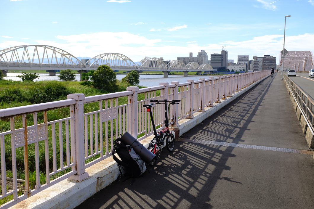 走り始めて数分で、大阪のガンジス(←勝手に命名)、淀川が見えてきた。阪急の線路と並行して架かる十三大橋は、北からも南からも通勤通学で多くの人が行き交う生活に密着した橋だ。あまりの暑さに出発を遅らせたが、夕方近くになっても日差しがきつい。でもゆったり流れる川面はいい雰囲気だ。久しぶりのキャンプに、心が躍る。