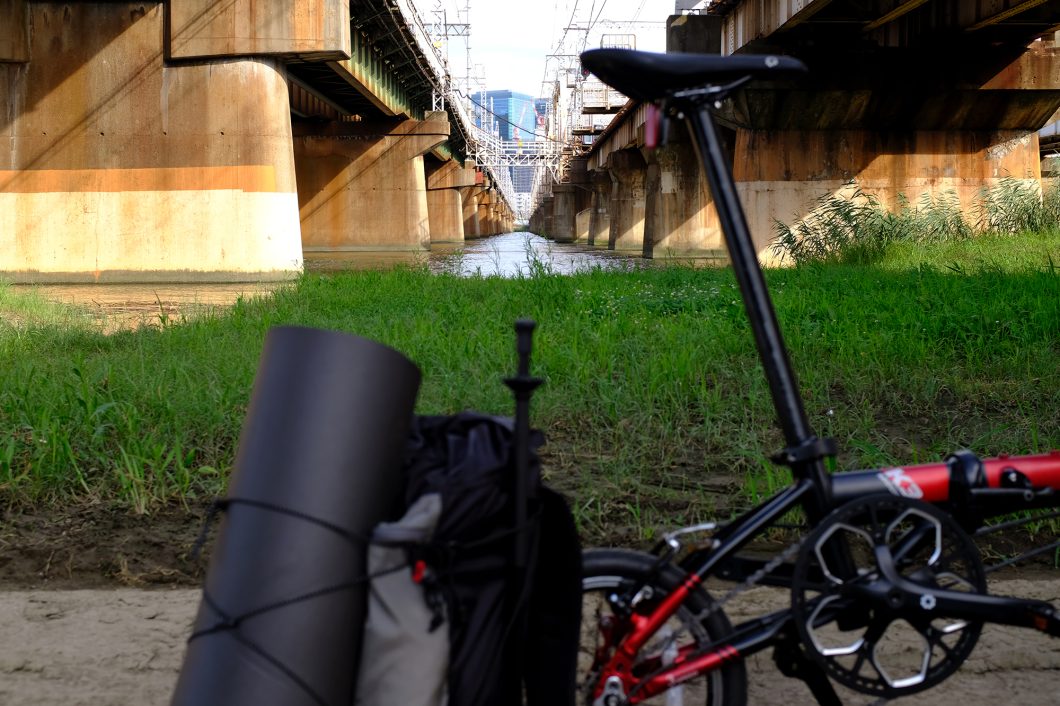 十三側に渡って河川敷に下りる。目指すキャンプ場は、河川敷を走ってすぐだ。阪急の線路に挟まれて向こうにグランフロント大阪の見えるこの景色は、昔から気に入っていて自分的定番の撮影スポットのひとつ。
