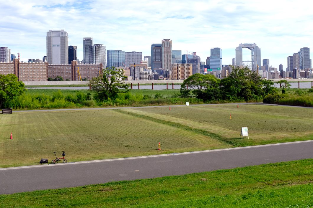 ……と、寄り道しながらも、河川敷を数分走れば到着。今回利用するキャンプ場はその名も「淀川キャンプフィールド」だ。堤防の上から眺めてみた。だだっ広い芝生。そして川向こうに見えるのが梅田の街並みだ。