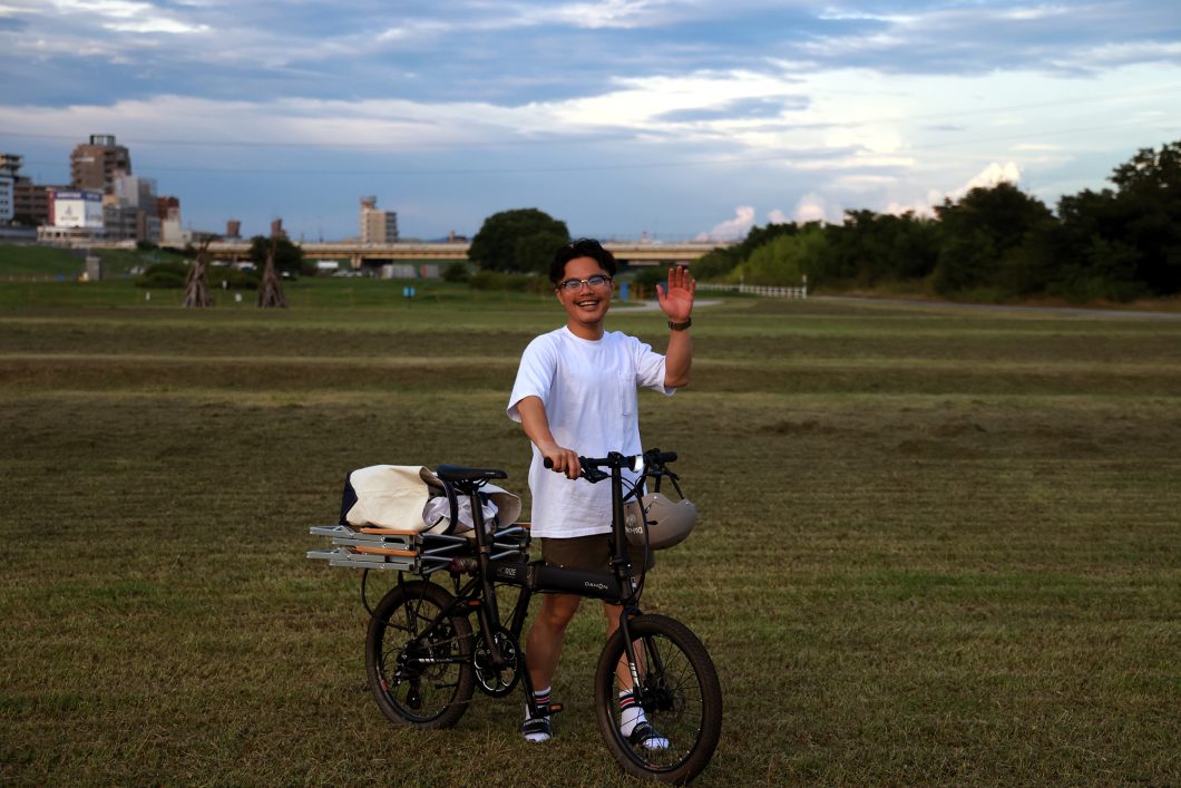 ちょうどいいタイミングで、今回のゲストがやってきた。上で自分「たち」と言ってた件だ。今回のキャンプ場まで自宅から自走できるというので、折りたたみチェアや焚き火台などを持ってきてもらった。自転車は、太いタイヤが河川敷の未舗装路にも似合うDAHONのHorize Disc。カスタムで装着しているリアラックにはもっと積載できそうなので、もっと色々お願いすればよかった。