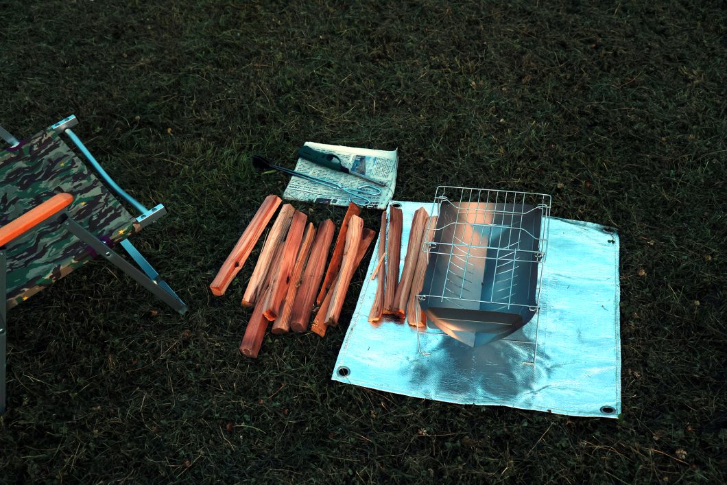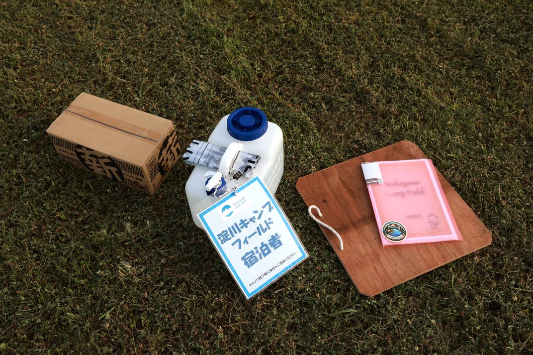 「ゲスト」とは名ばかりで、一緒に色々と手伝ってもらった。受付で薪を購入してきた。非常用の水が入ったポリタンクと、焚き火シートの下にさらに敷く木の板。綺麗な芝生を守るには、本来はこれくらい必要ということだ。