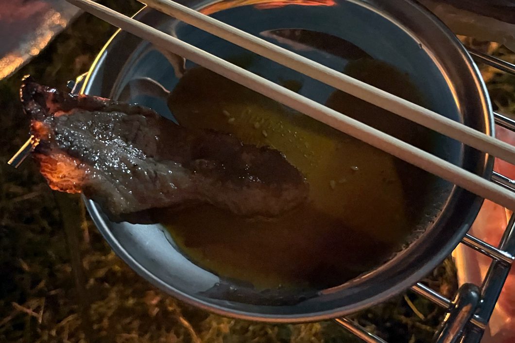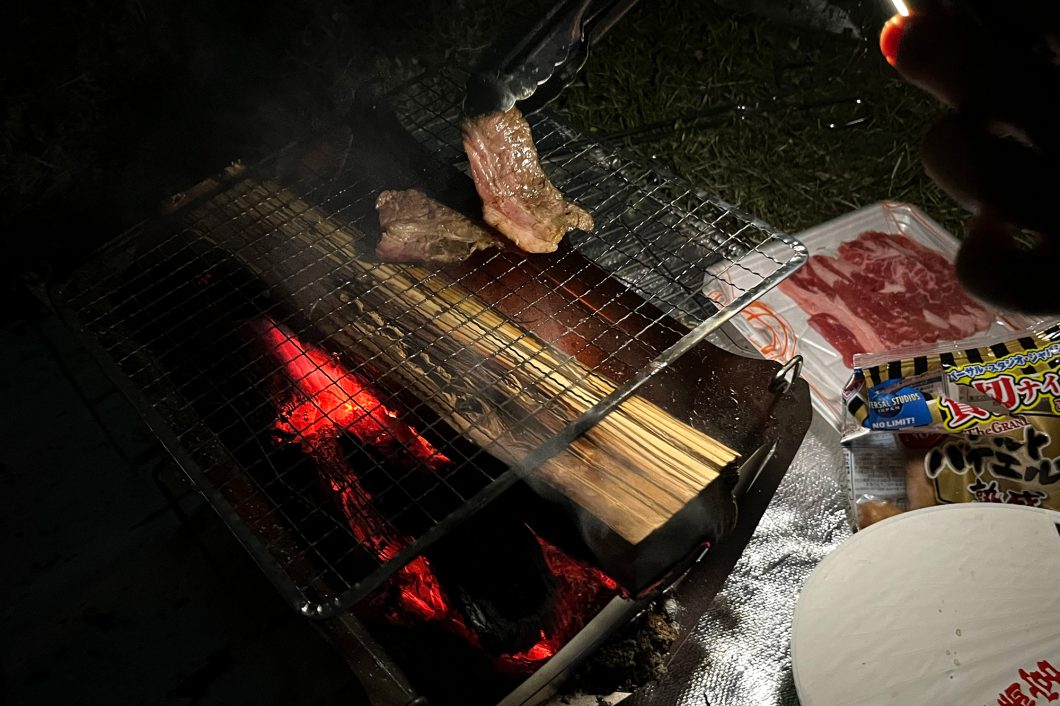 献立はシンプルに焼肉とした。少しずつ焼きながら食べられるし、絶対に美味しいし、何より料理のスキルが問われない。火起こしは協力しあったが、肉の管理はゲストが完璧にしてくれた。天国だ。