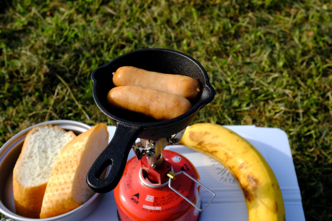 彼が帰っていったので、あらためてゆっくり朝食を。BE-PAL付録のCHUMSコラボの鋳鉄製ミニスキレットで、ウインナーを焼いて、パン、コーヒー、バナナと。