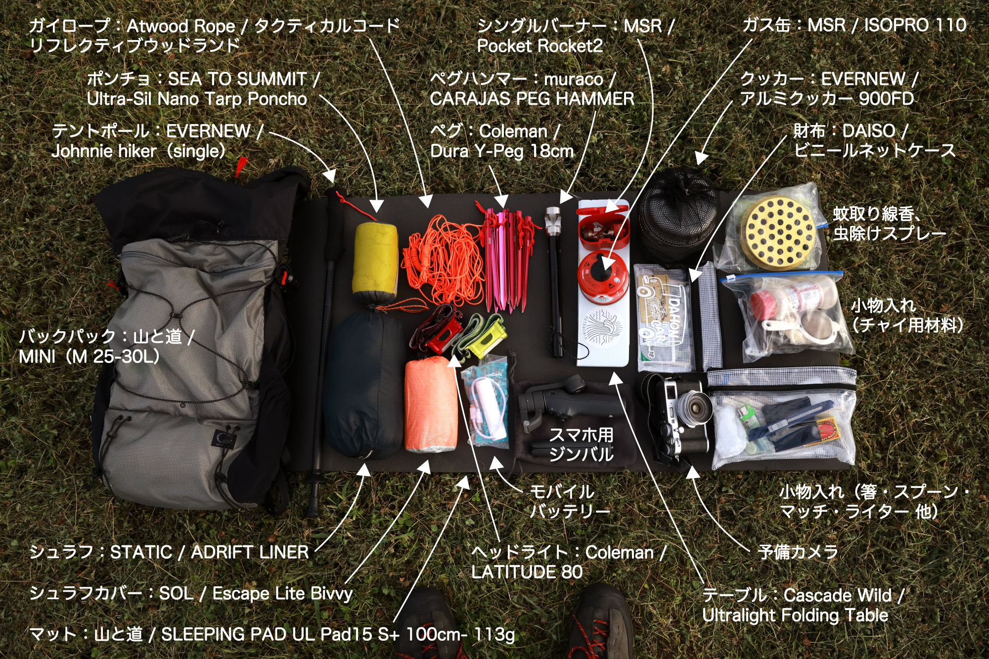 今回は夏の装備となり、シュラフや衣類がだいぶ軽量化された。シュラフカバーは前日までの雨で地面が濡れていたり急な雨の時用に念のため持ってきたが、使うことはなかった。シュラフはメッシュの薄いシーツ系で、頭まで被れば虫対策になる。