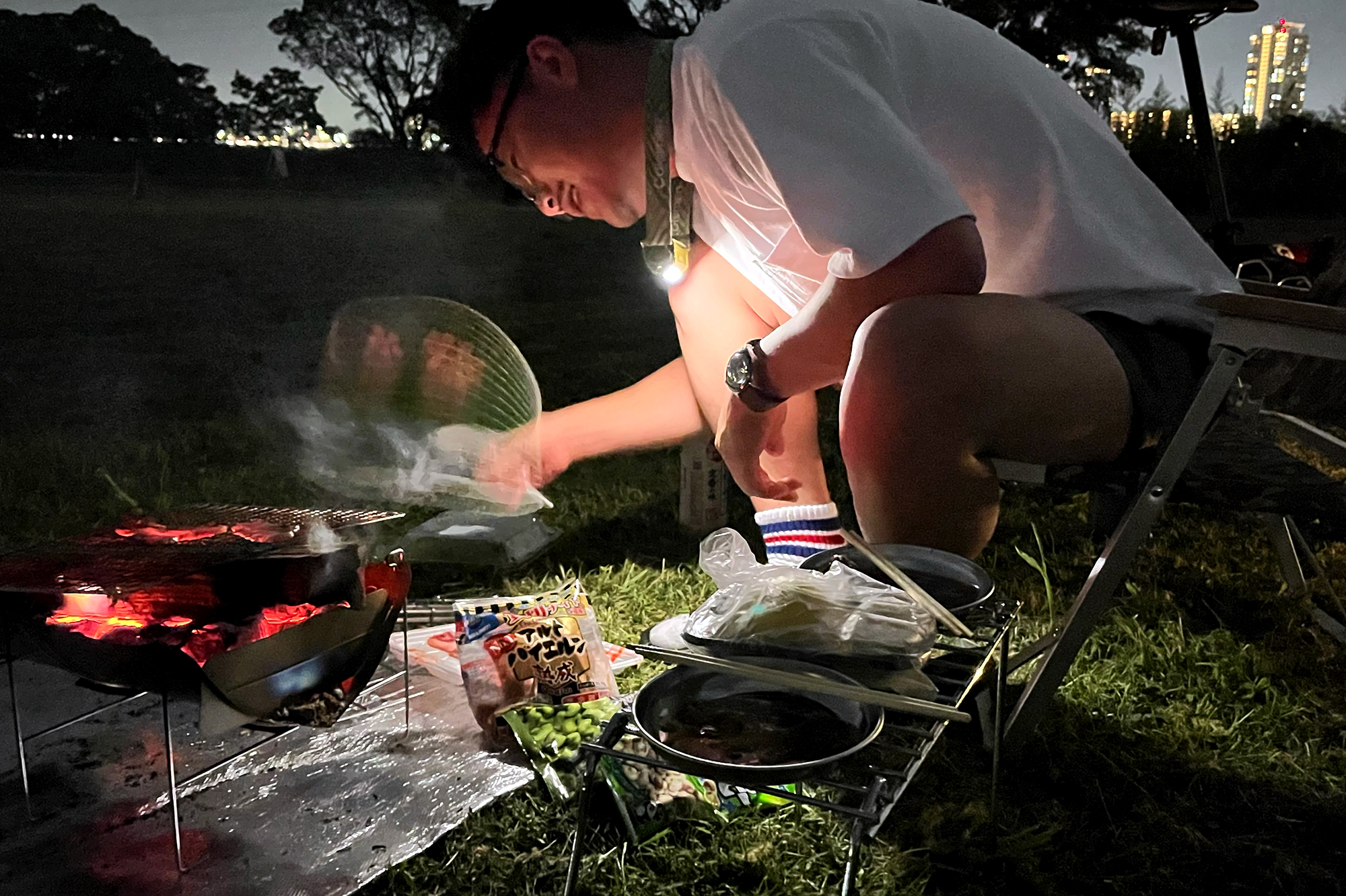 献立はシンプルに焼肉とした。少しずつ焼きながら食べられるし、絶対に美味しいし、何より料理のスキルが問われない。火起こしは協力しあったが、肉の管理はゲストが完璧にしてくれた。天国だ。