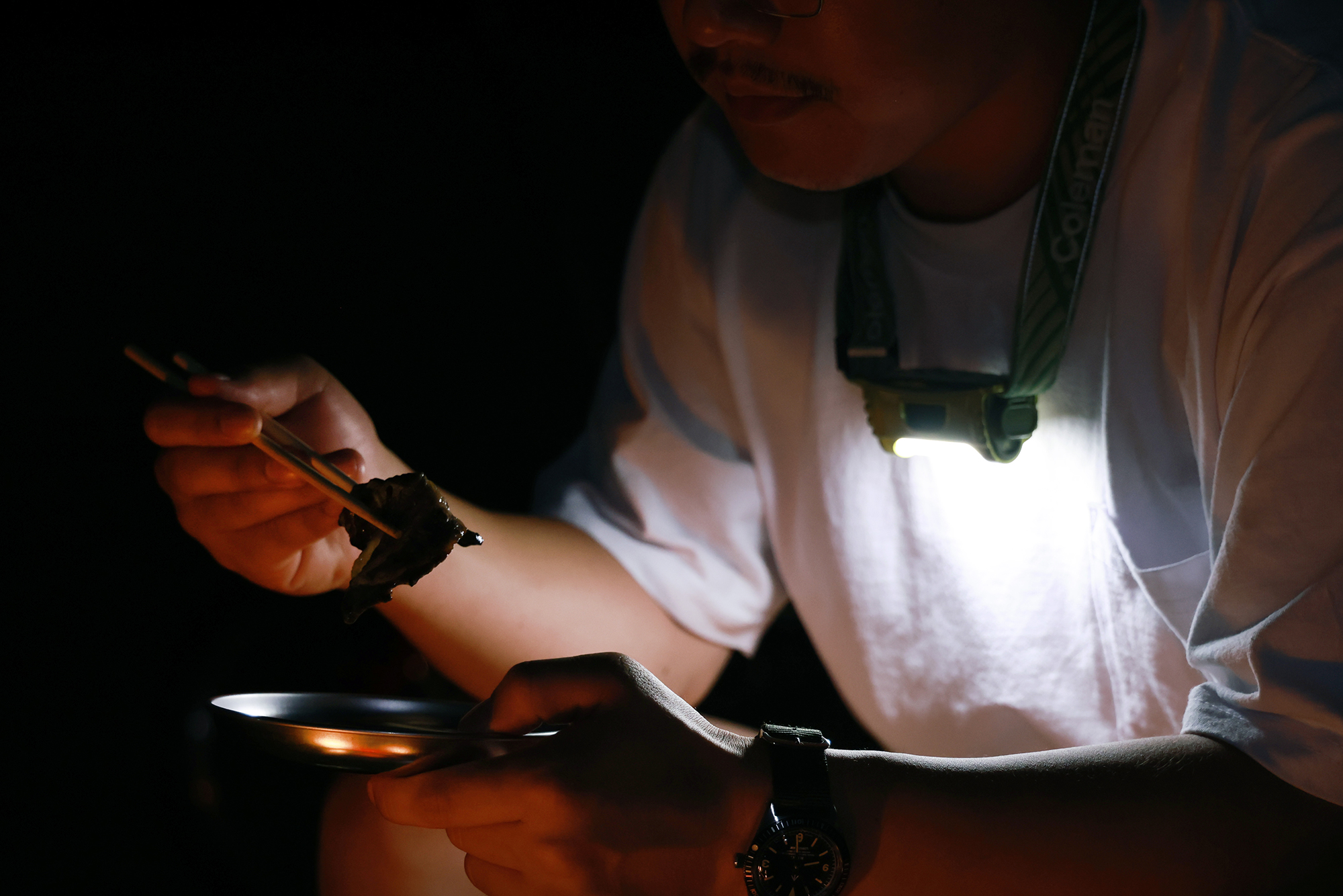 ひっそりと自然の中で静かな時間を過ごすソロキャンプとはまた違う、話し相手がいる時間も心地いい。時々パチンと鳴る焚き火の音を聞きながら、都会の夜景をボーッと見る。