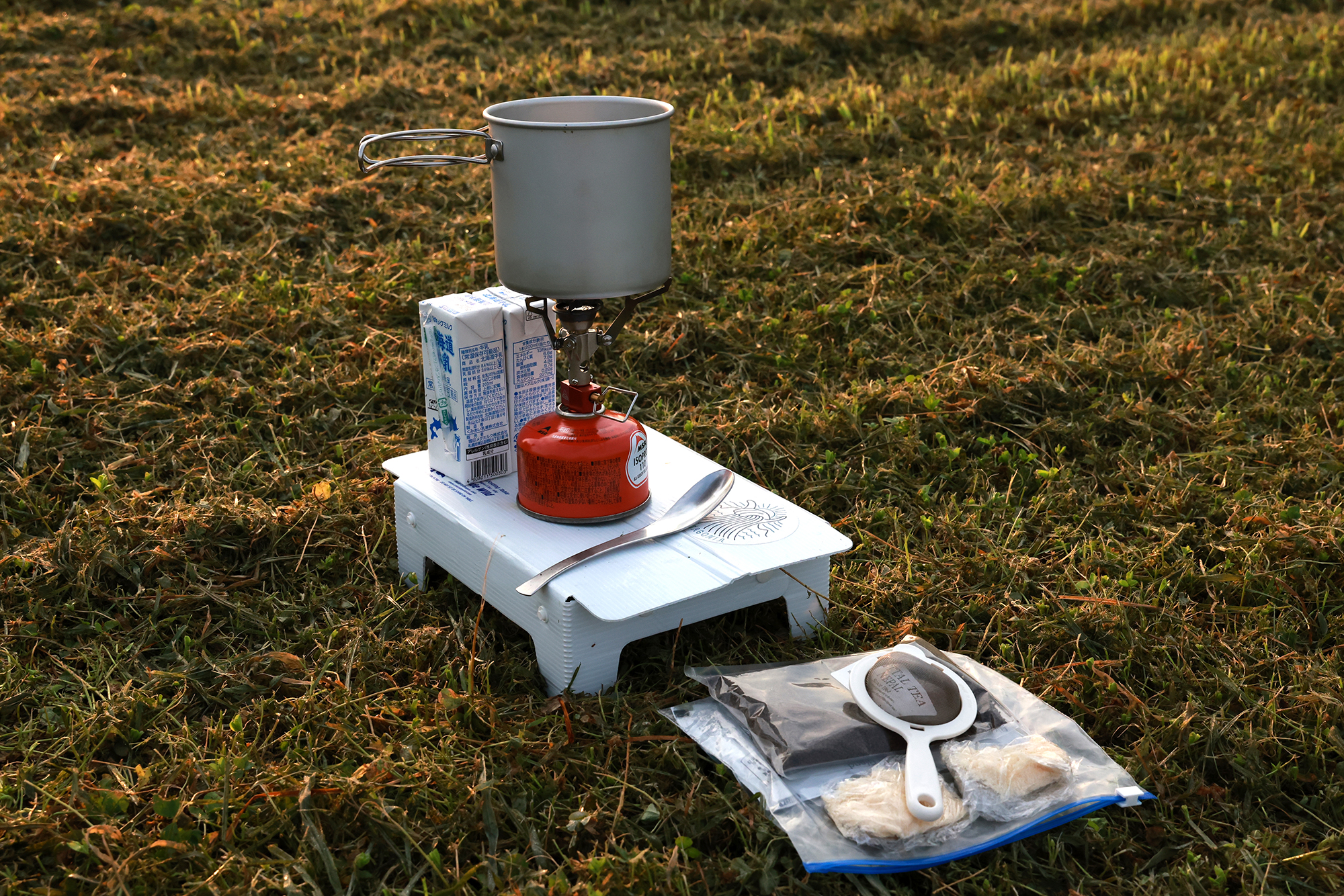 コンビニへの買い出しなどでバタバタしていたら、すっかり夕暮れ。さっそく設営していこう。設営自体はいつもどおり一瞬で終わるのだけど、今日はお楽しみがあるのだ。