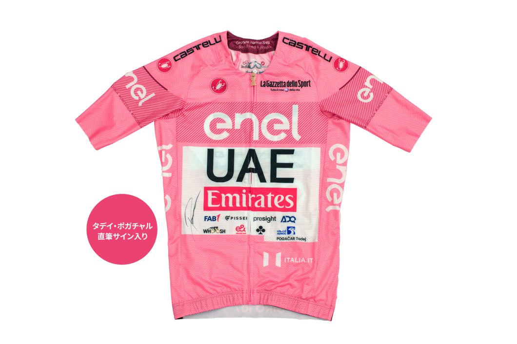 ロードレース界最速、最強の男 タデイ・ポガチャルが、トリプルクラウンの第一歩として獲得したジロ・デ・イタリアでの勝利を示す UAEチーム・エミレーツデザインと特別なジャージです。さらにポガチャル直筆サイン入りは、世界でも限られた数しかなくとても貴重なポガチャルグッズです。