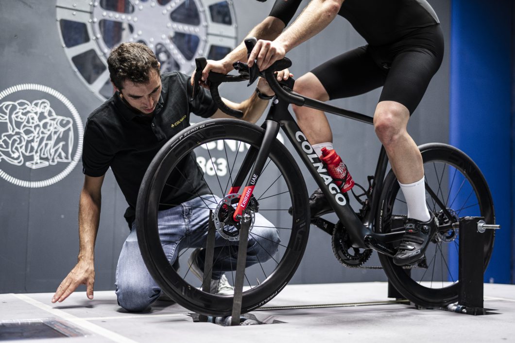 特に近年は走行時の空気抵抗を減らすため、エアロダイナミクスに特化した設計が顕著です。機材の進化によりロードレースのスピードはどんどん上がっています。平坦でも時速70km以上、下り坂では時速100kmを超えることも少なくない近年のレースでは、走行時にかかる空気抵抗は大きな課題です。そのため、各メーカーはテストバイクを風洞テストにかけて数値を取得し、車体全体のパーツ形状、重さやバランスなどを細心の注意を払って調整していきます。そうして仕上がった完璧なロードバイクが選手たちに与えられます。