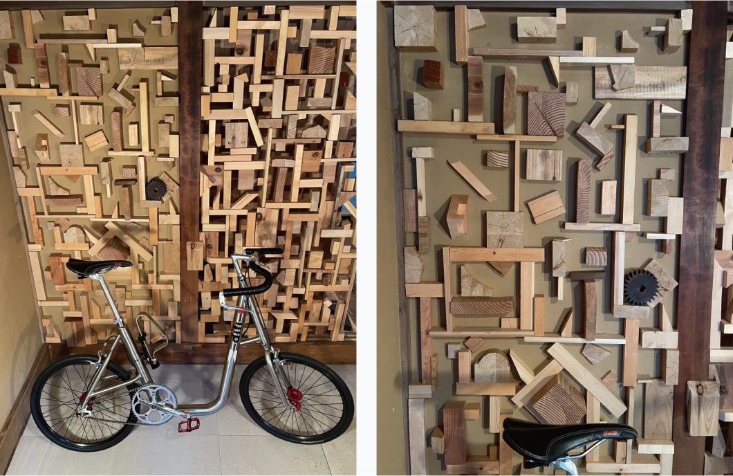 このパーテーション、私が作ったんですけど、もとは自宅を改築する時に大工さんが切った木っ端なんです。ちょうどパーテーションを買おうと思っていて、せっかく良い木なんで捨てるのは勿体無いと思って、木っ端をそのまま貼りつけただけなんですけど、何とか使えないか、何とかまた命を与えられないかという、割と会社のコンセプトを象徴していると思います。