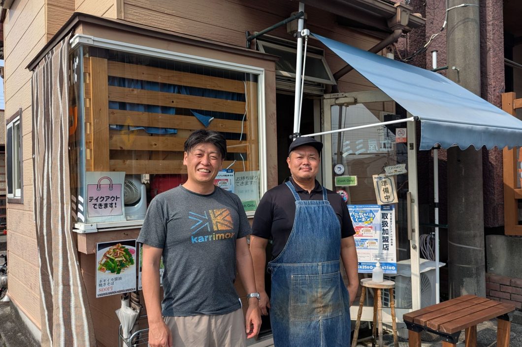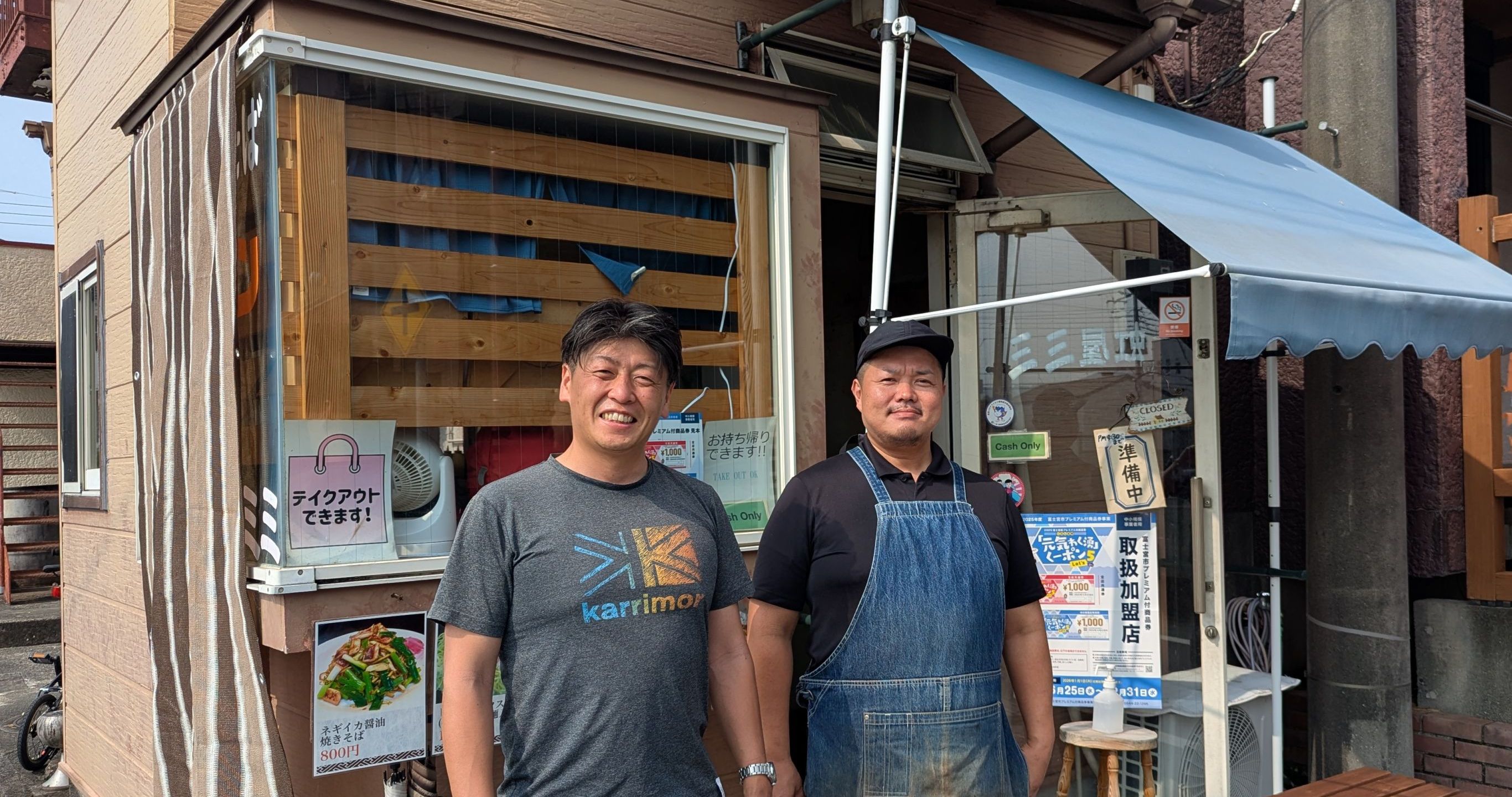 富士宮やきそばを心から愛するふたり。虹屋ミミの店主と北村さんのツーショット。重ねて書くが、店主は見た目はイカツイが、気さくなお兄さんである。ちなみに虹屋ミミはお兄さんのお母さんが始めたお店で、ミミはお母さんの娘さん、すなわち店主の姉の名前だそうだ。そして虹屋というのは、今から何十年か前、お店の開店日にきれいな虹がかかったそうで、それで虹屋と付け足したそうである。