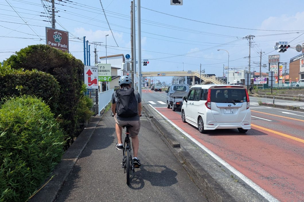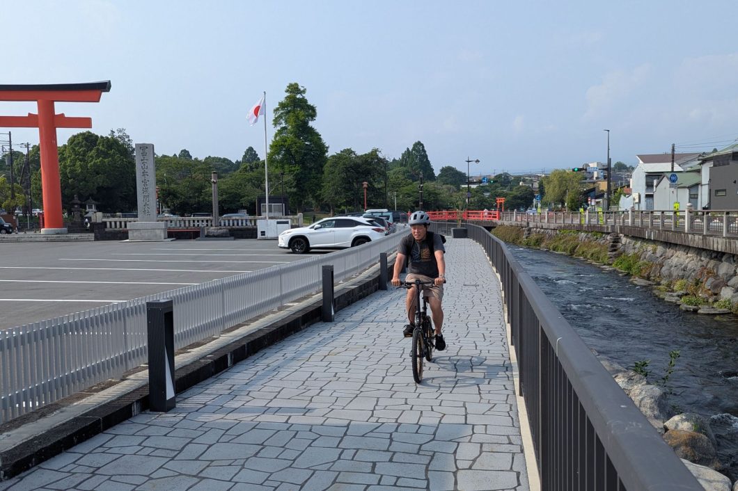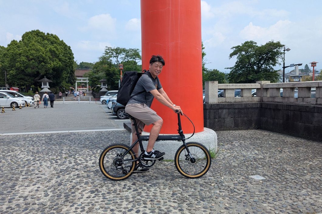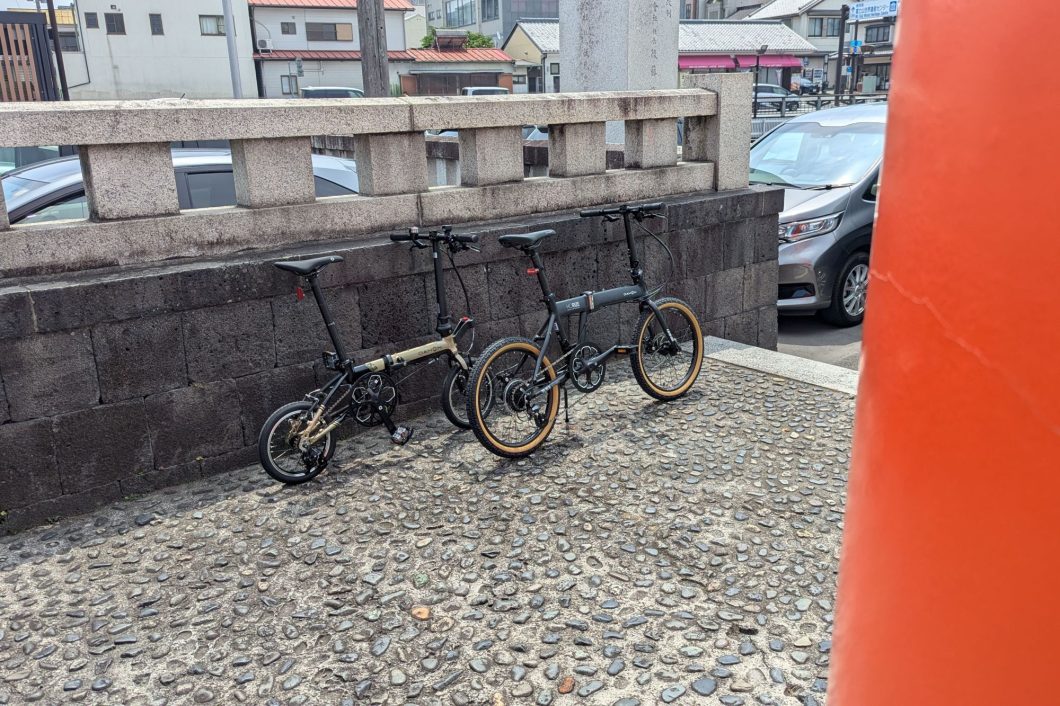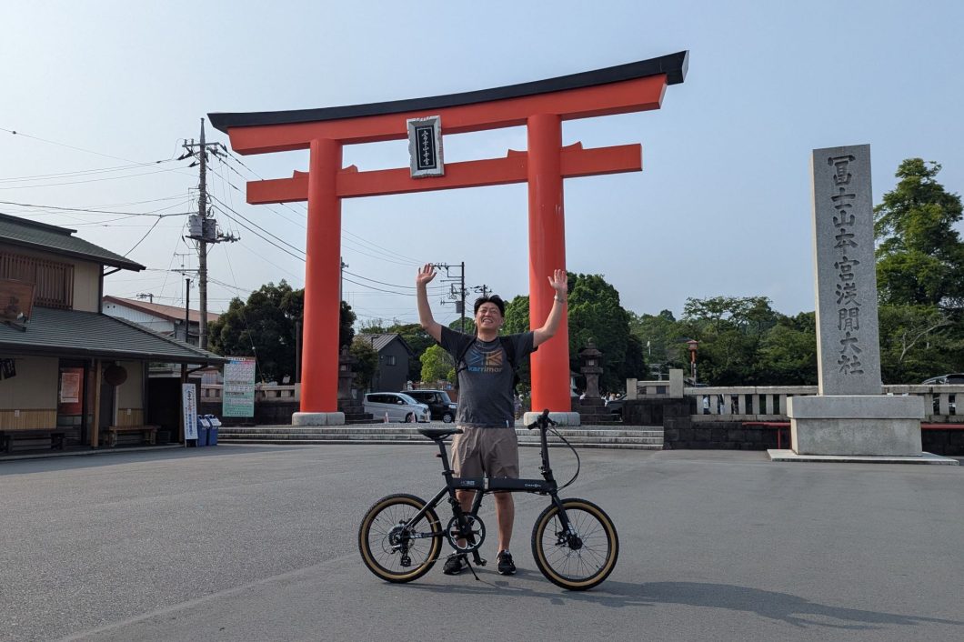 というわけで、7月のある日曜日の午前10時半、北村さんと待ち合わせしたのは、富士宮浅間大社の二の鳥居の下。1時間ほど早く着いたので、富士宮浅間大社に参拝し、今日の自転車散歩の安全を神様にお願いしてから、自転車を準備して、北村さんの到着を待つ。気温はすでに30℃を超えている。暑い一日になりそうだ。ちなみに今回乗る自転車は、北村さん用がDAHON「Horize Disc ltd. 」のマットブラック(写真右)、自分(筆者)がDAHON「K3」(写真左)である。