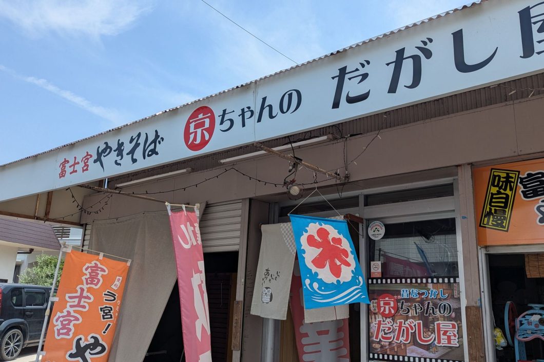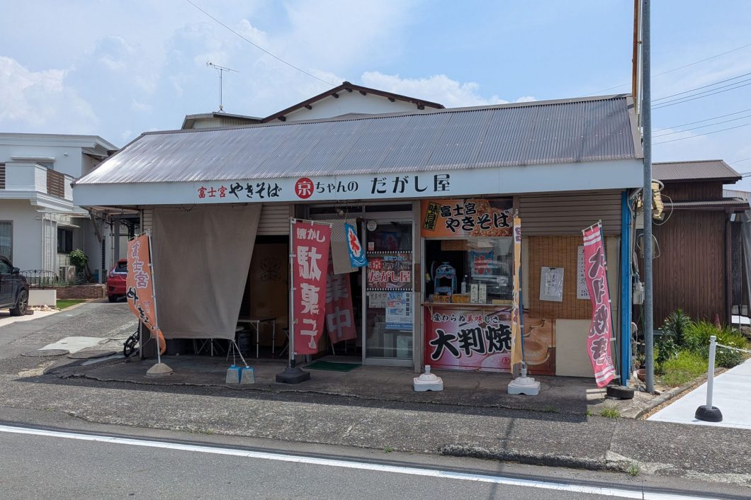 北村さんと最初に向かったのは、富士宮浅間大社から走って10分ほどの距離にある「だがし屋 京ちゃん」。その名のとおり、ここは駄菓子屋とやきそば屋が合体した形態のお店である。