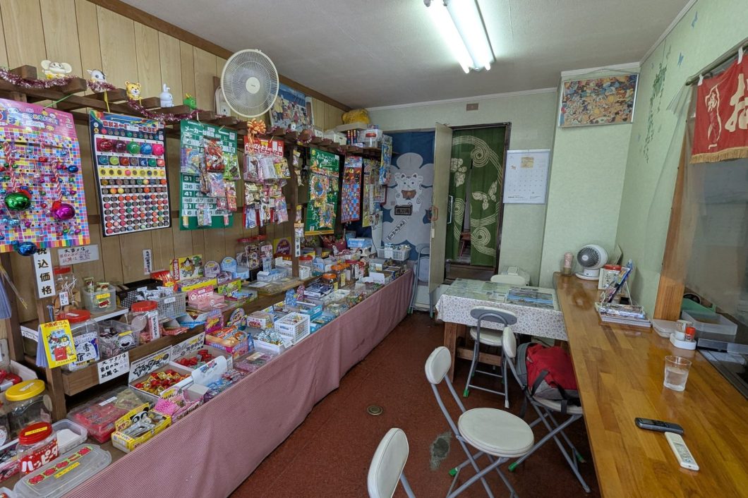 早速店内に入ってみる。昔なつかしいたくさんの駄菓子と、焼きそばを食べるためのカウンターがある。北村さんいわく、このスタイルが富士宮やきそばの原点なんだそうだ。
