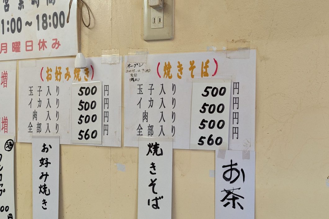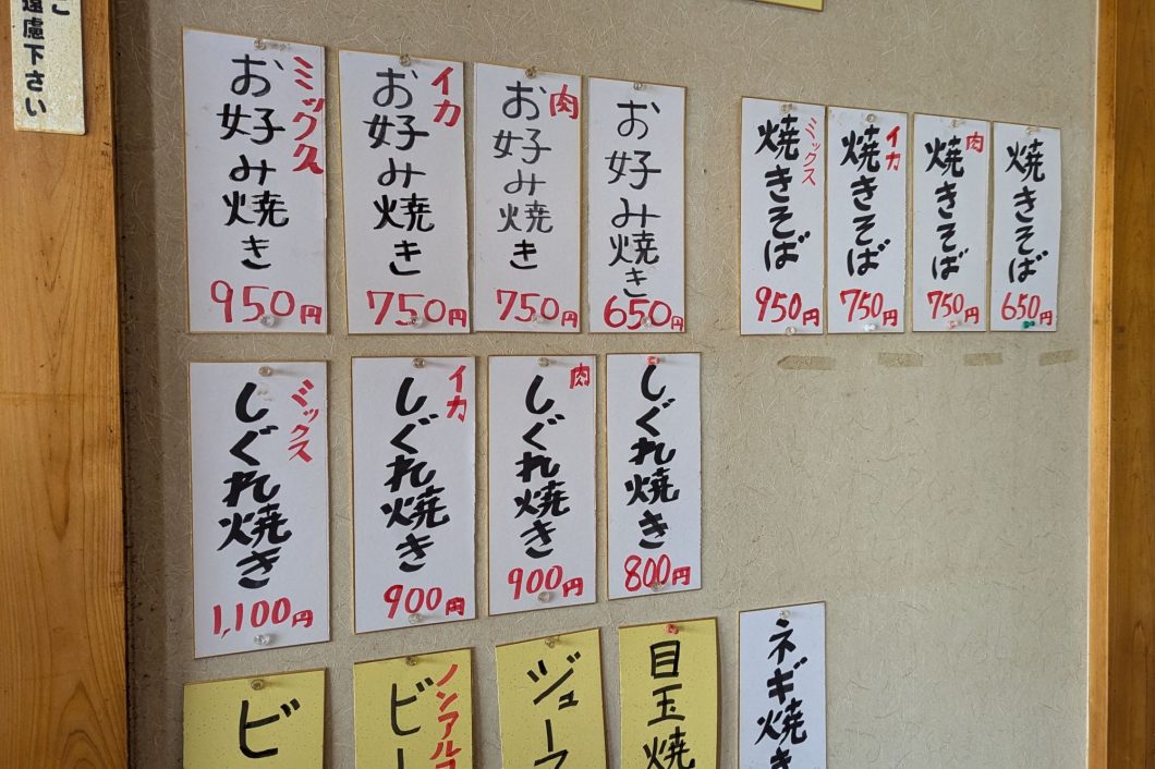 こちらがはっちゃんのメニュー。焼きそばのほかに、富士宮やきそば屋さんの定番メニューのお好み焼きとしぐれ焼きがラインナップされている。ここでは、北村さんのすすめにしたがい、しぐれ焼きミックスを注文する。