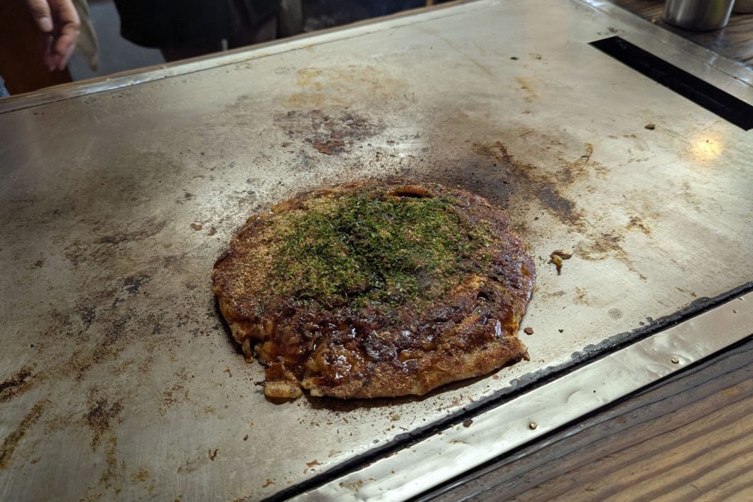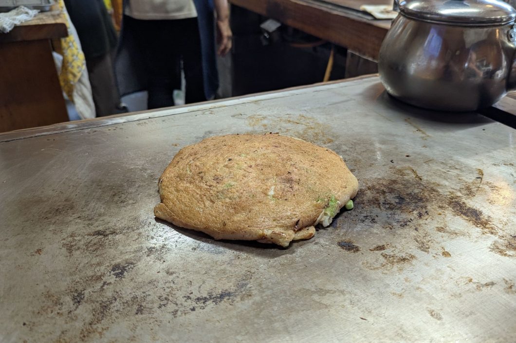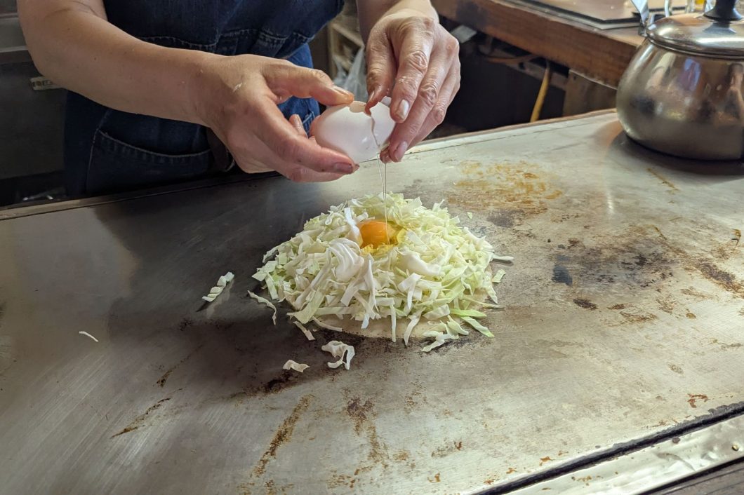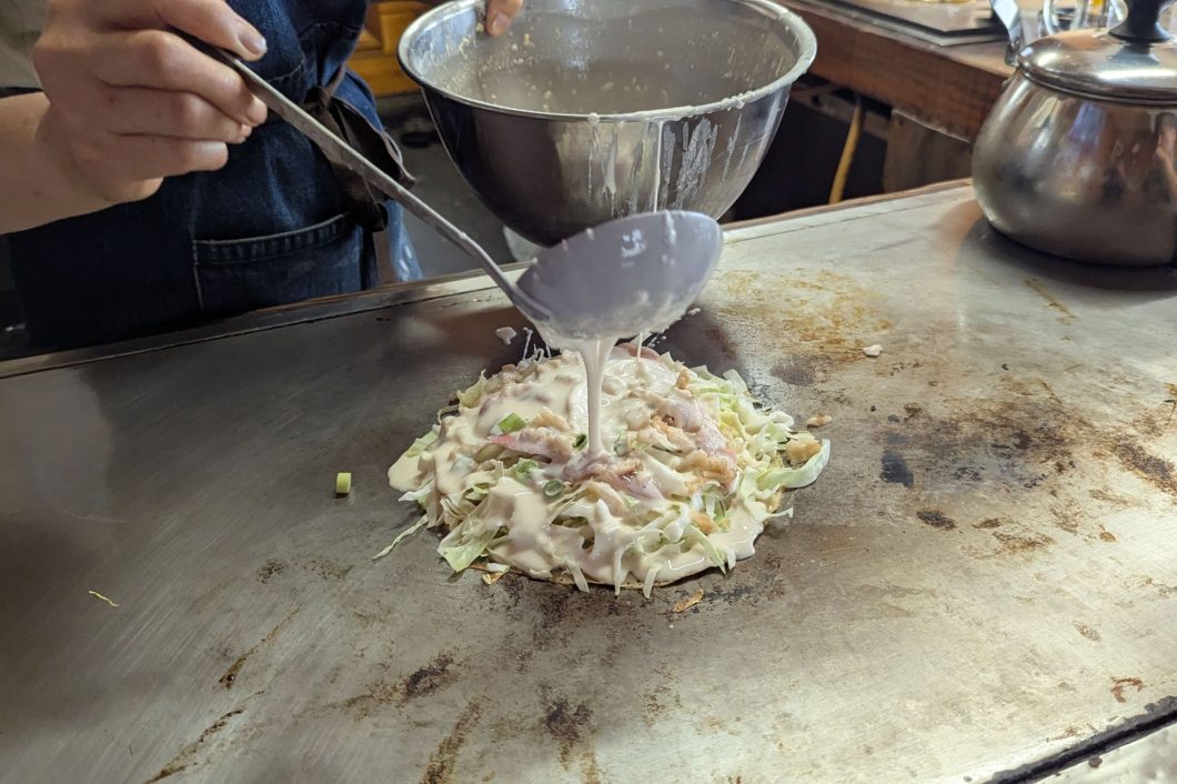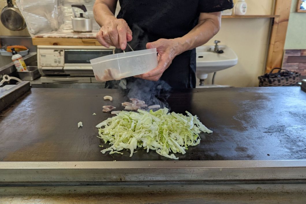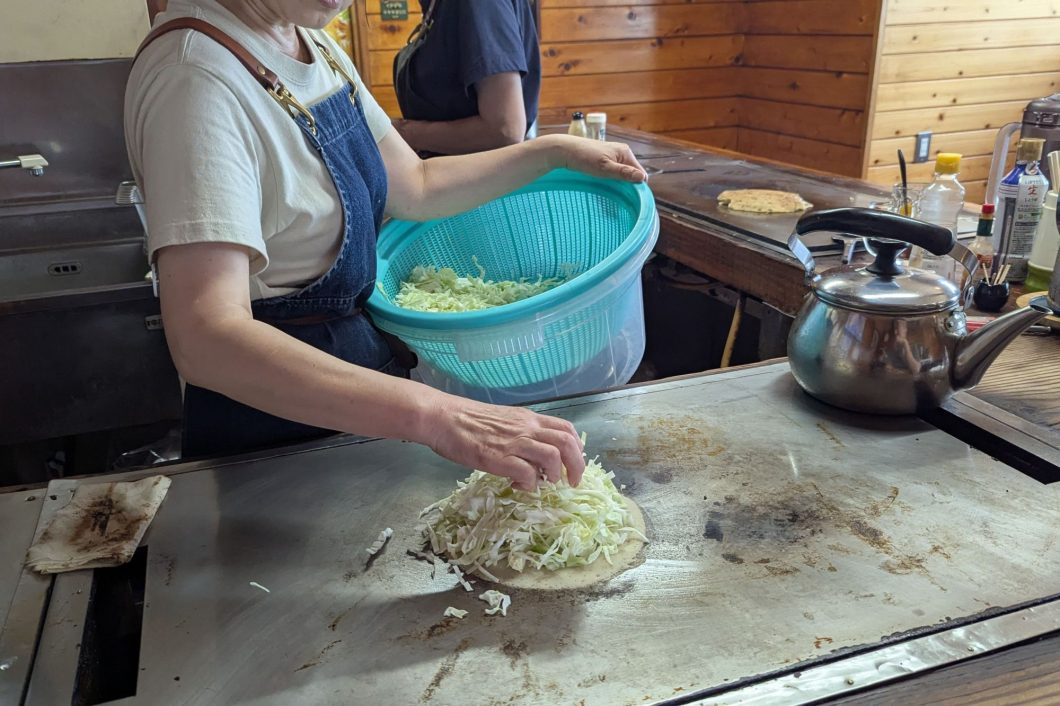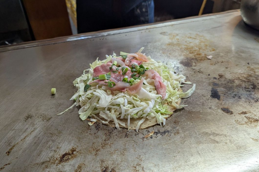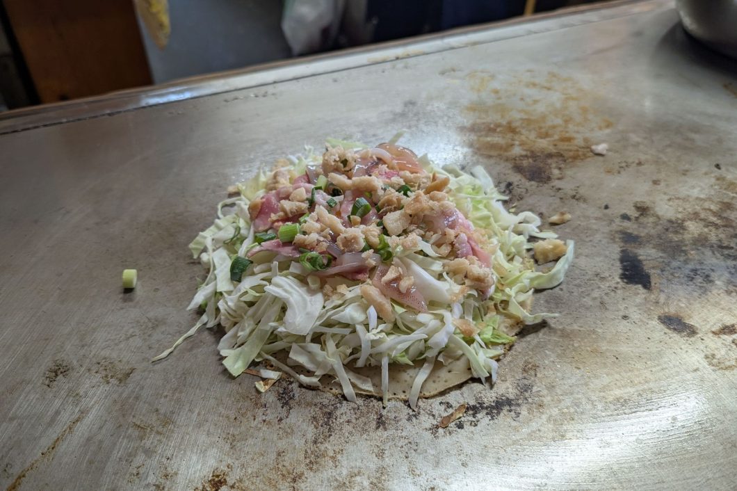 さきほどの話し合いをふまえて、ここではお好み焼きミックスを注文する。すぐに目の前で調理が始まる。うすくまる~く引き伸ばした生地の上にキャベツをドバっとのせたら‥