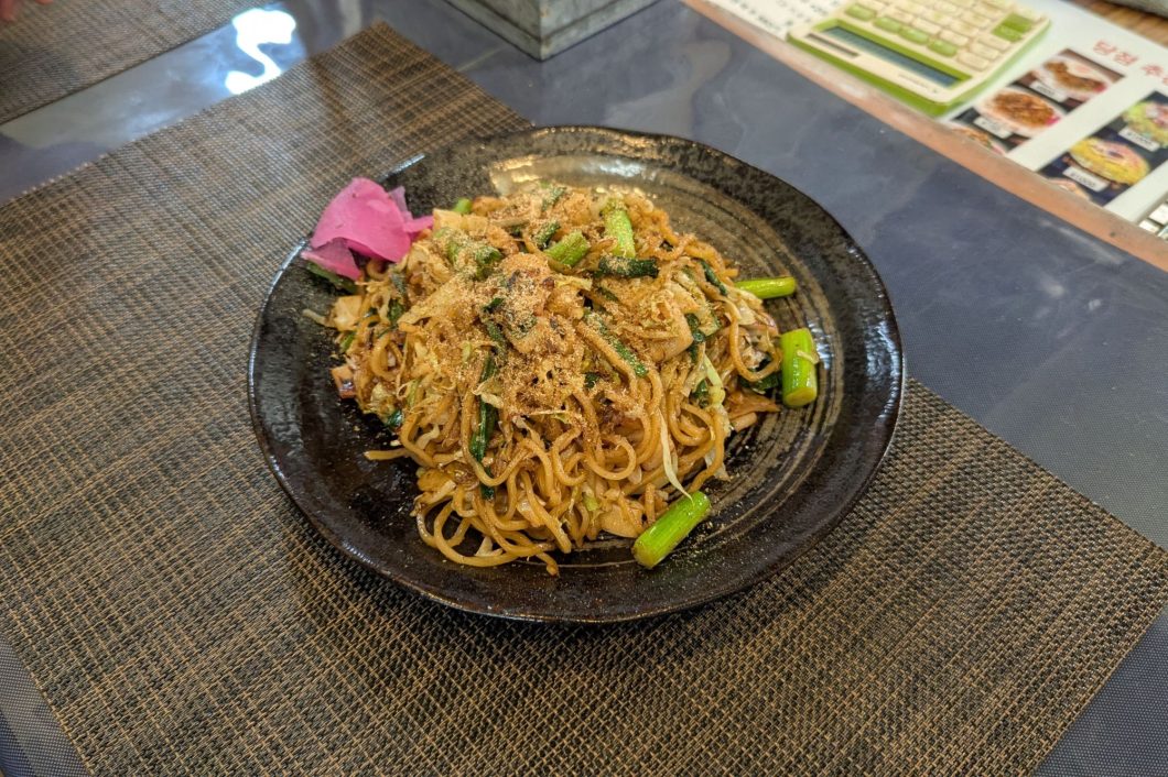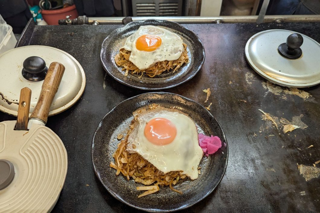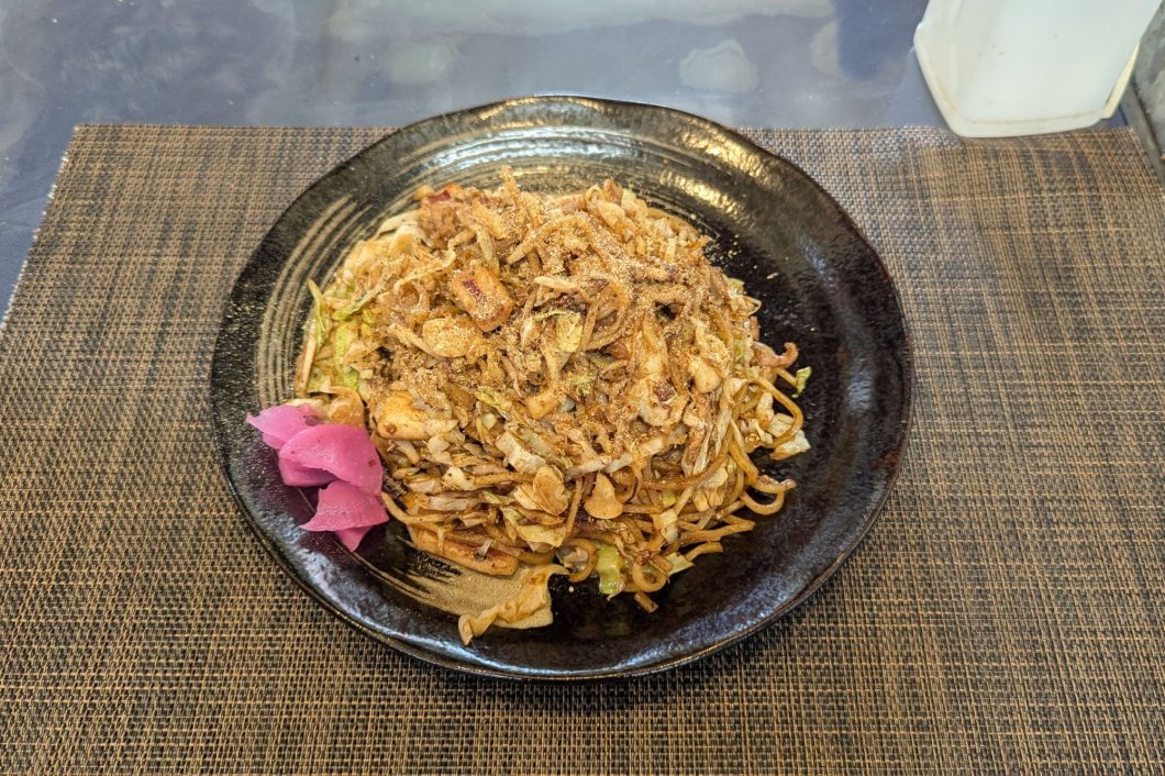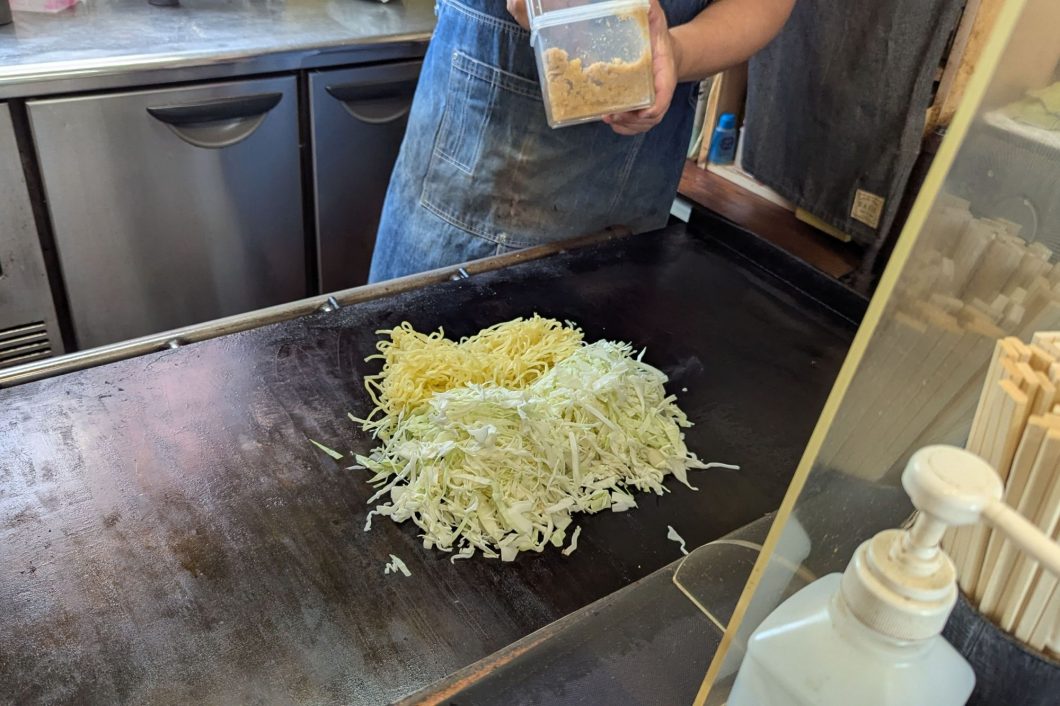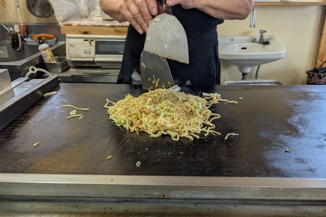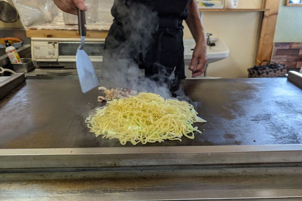 つづいて焼きそばを炒める。写真の量は1.5人前。このあとやきそば屋さん巡りをすると言ったら、「1人前ずつは多いから、1.5人前(大盛)を2人でわけたら」と言ってくれたので、その言葉にすなおにしたがうことにした。
