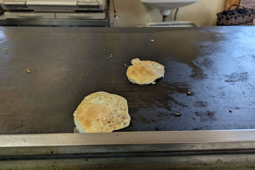 目玉焼きをひっくり返す。すぐにひっくり返すから、焼き面が固くならず、フワフワなかんじに仕上がる。