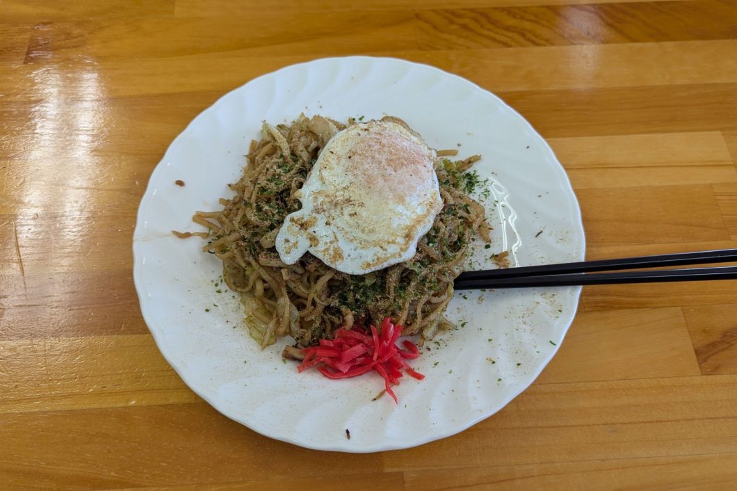 最後にまとめてお皿に盛り付けて、紅ショウガをそえたらできあがり!ああ旨そう。さっそく食べてみる。しっかりとした噛みごたえがあって、世の中一般的な、ねっとりやわらかな食感の焼きそばとはだいぶ違う。