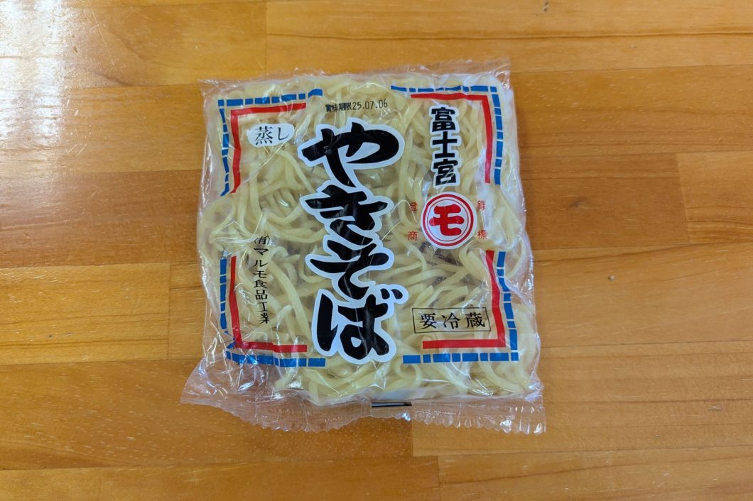 これが、富士宮やきそばが富士宮やきそばであるゆえん、その名も「蒸し麺」である。一般的な焼きそばの麺は、蒸したあとに茹でるという工程で製造されるが、この麺は、蒸す→急速に冷やす→油で表面をコーティングする、という工程で作られる。そのため水分量の少ない、コシのあるモッチリした食感になる。蒸し麺のメーカーは富士宮市内に4社あり(マルモ食品工業、叶屋、曽我めん、さのめん)、市内の焼きそば屋さんは、基本的にこの4社のうちのどれかの麺を使っている。