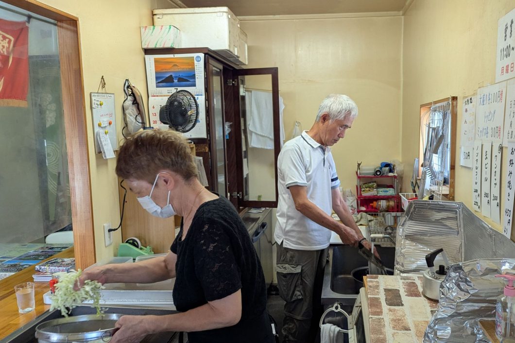 お願いして厨房の中も撮らしてもらった。写真のふたりが、駄菓子屋京ちゃんのご主人と奥さん。ご主人の実家のすぐ横に「おたま」という、地元で有名な駄菓子屋さんがあり、ご主人は子どもの頃、よくそこで焼きそばを食べていたそうだ。おたまは、店主のおばあちゃんが93~94歳ぐらいになるまでひとりで営業していたそうだが、最後はおばあちゃんが亡くなって閉店してしまった。それを知ったご主人は、「このままでは、富士宮の焼きそば文化のひとつがなくなってしまう」と焦り、そして会社勤めを辞めて、京ちゃんを開業したそうである。人に歴史ありである。ちなみに奥さんは東京都墨田区の深川出身。彼女にも歴史があるが、はやく2軒目のレポートにいきたいので、割愛。