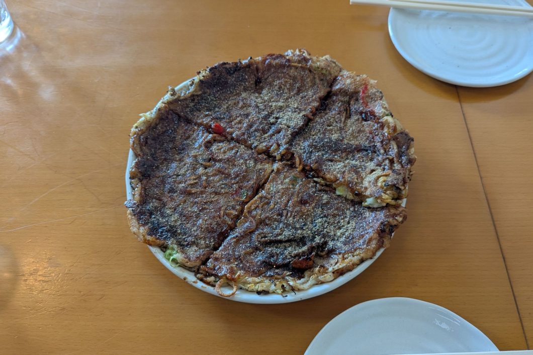 これがしぐれ焼き。「しぐれ焼きなんて初めて聞いた」という人も多いのではないだろうか?じつは自分もそうだ。はじめて聞いて、はじめて食べた。しぐれ焼きとは、かんたんにいうと、焼きそばとお好み焼きを合体させたもので、物質の構成的には、広島風のお好み焼きや、関西のモダン焼きと同じだが、その食感はまるで違う。焼きそば部分はパリッパリで、お好み焼き部分はトロットロ。今までに味わったことのない、未知との遭遇的食感なのだ。