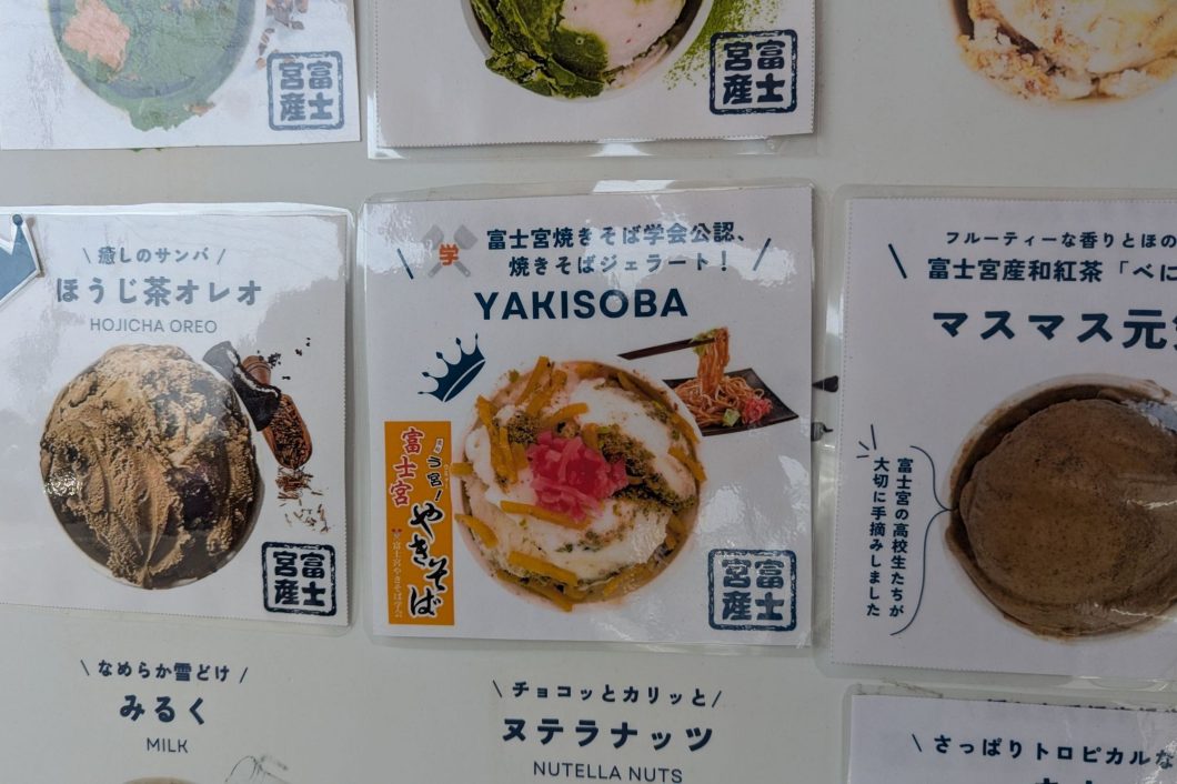 メニューの中に、焼きそばジェラート「YAKISOBA」を発見。S Gelato & Snackさんは、地元食材を使ったジェラートを出すお店で、富士宮産の抹茶やほうじ茶を使ったジェラートもある。今回は「YAKISOBA」と、ちょっと味変ということで「ほうじ茶オレオ」を注文。
