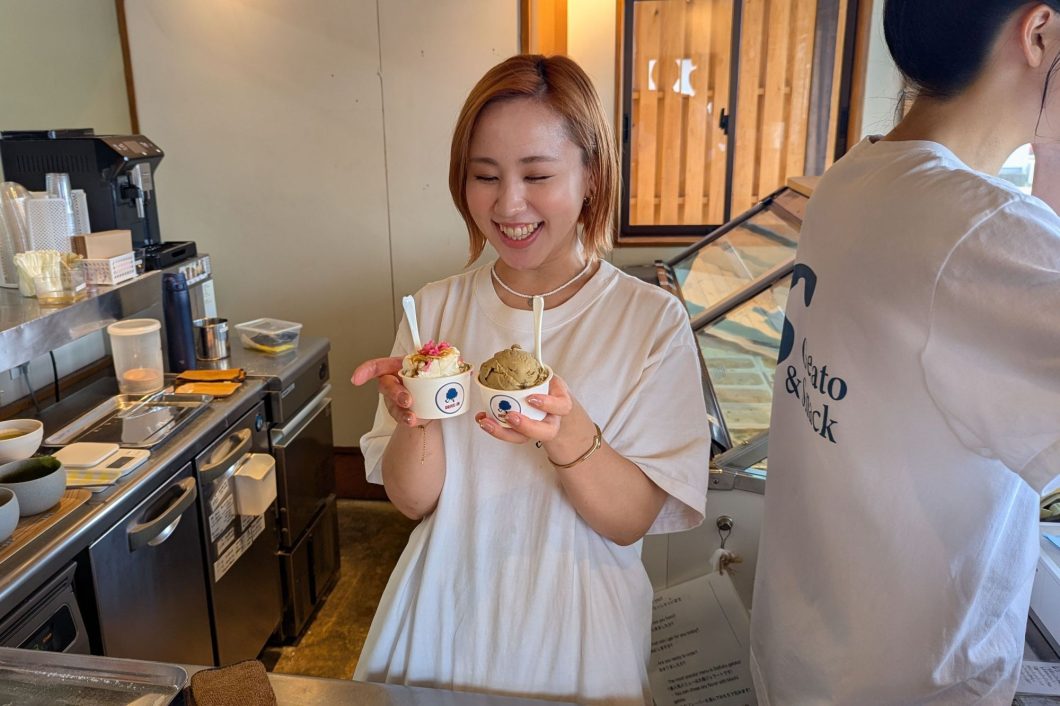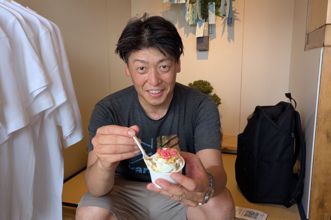 「YAKISOBA」ジェラートと北村さん。富士宮やきそば味のジェラート、いったいどんな味だと思いますか?北村さんの感想は「おっ!うまい」というもの。ひと口もらって食べたら、たしかにうまい。甘くて濃厚なミルクに紅ショウガがアクセントになっていて、素揚げした麺のパリパリとした食感も面白い。バニラ風味のジェラートと紅ショウガの組み合わせが、普通においしいから不思議である。