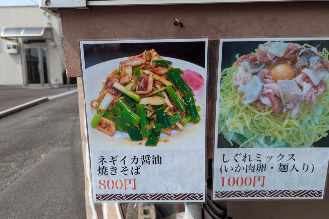店の前に写真付きのメニューが貼られていた。どれもうまそう。ちょっと悩んで、イチオシっぽい「ネギイカ醤油焼きそば」と、定番の「イカ肉焼きそば」を注文することにした。