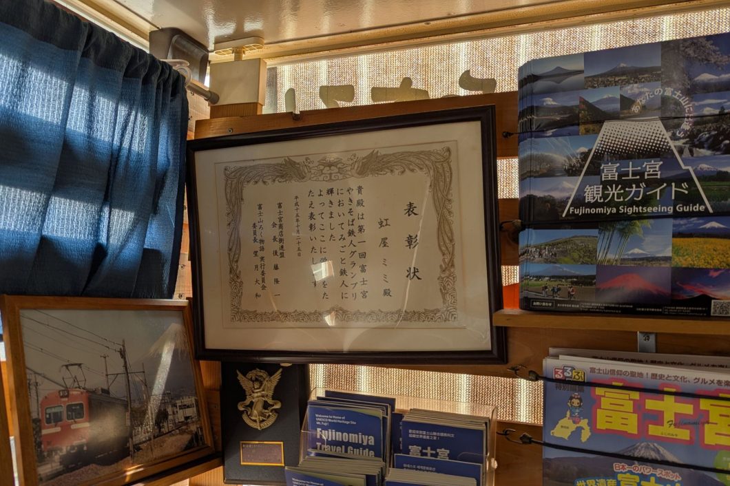 店内にひっそりかけられている第一回富士宮やきそば鉄人グランプリ優勝の表彰状。どこのお店が作ったかわからない焼きそばをいくつも食べて、一番美味しかった焼きそばに投票するという、本格的な覆面審査の結果、見事優勝したという。