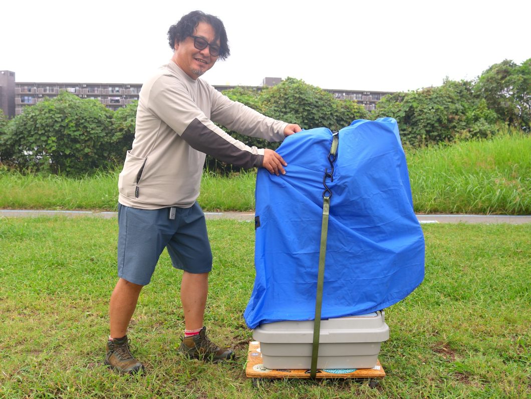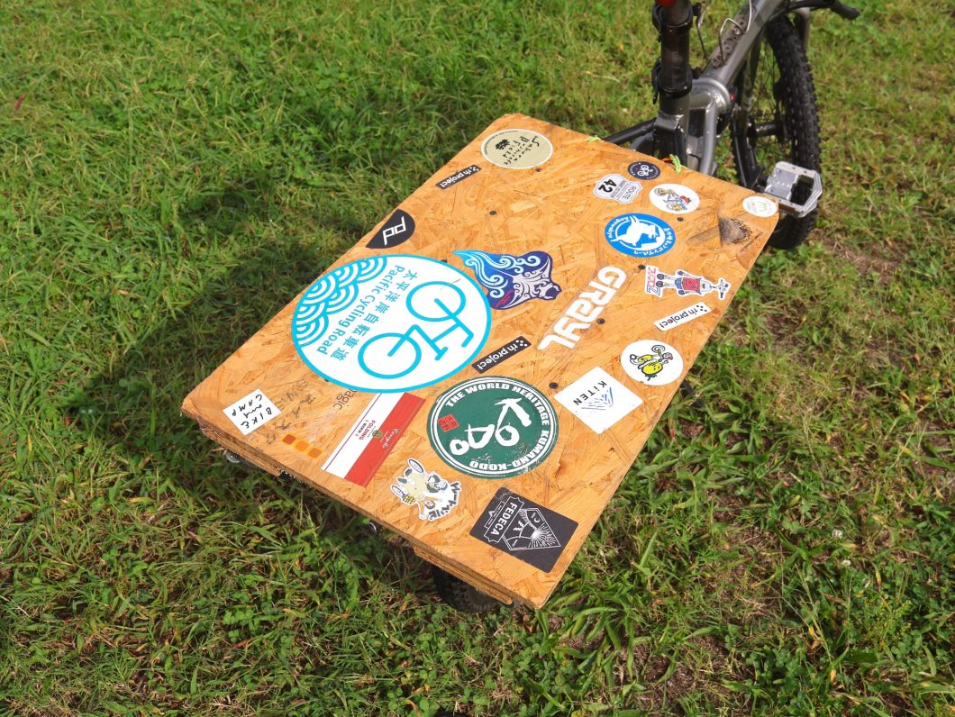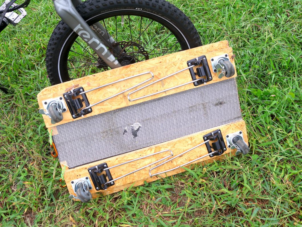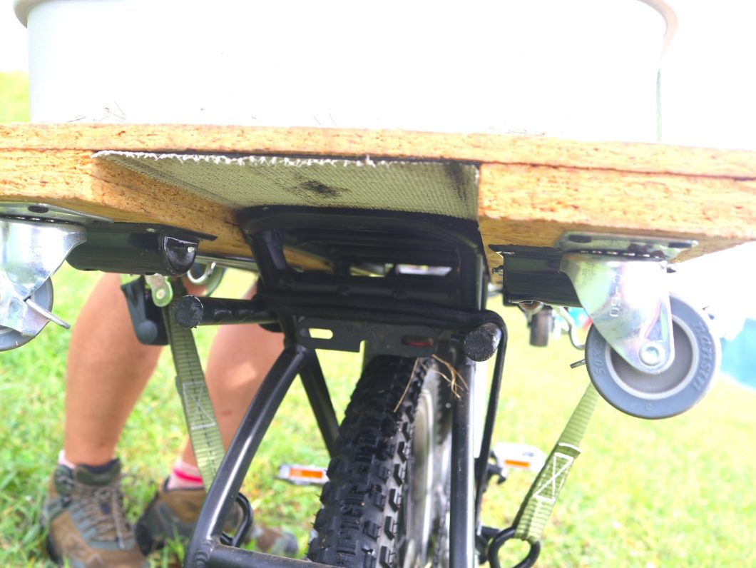 そうそう。まず板の下側をレールみたいにして、そこがキャリヤにぴったりハマるようにしてあります。滑り止めも付けた。これで幅広のコンテナボックスも安定して積めます。この板には折りたたみの脚を取り付けてあって、キャンプのときにはテーブルになる。そして移動するときにはコンテナボックスと輪行袋を載せてゴロゴロと運べるんです。