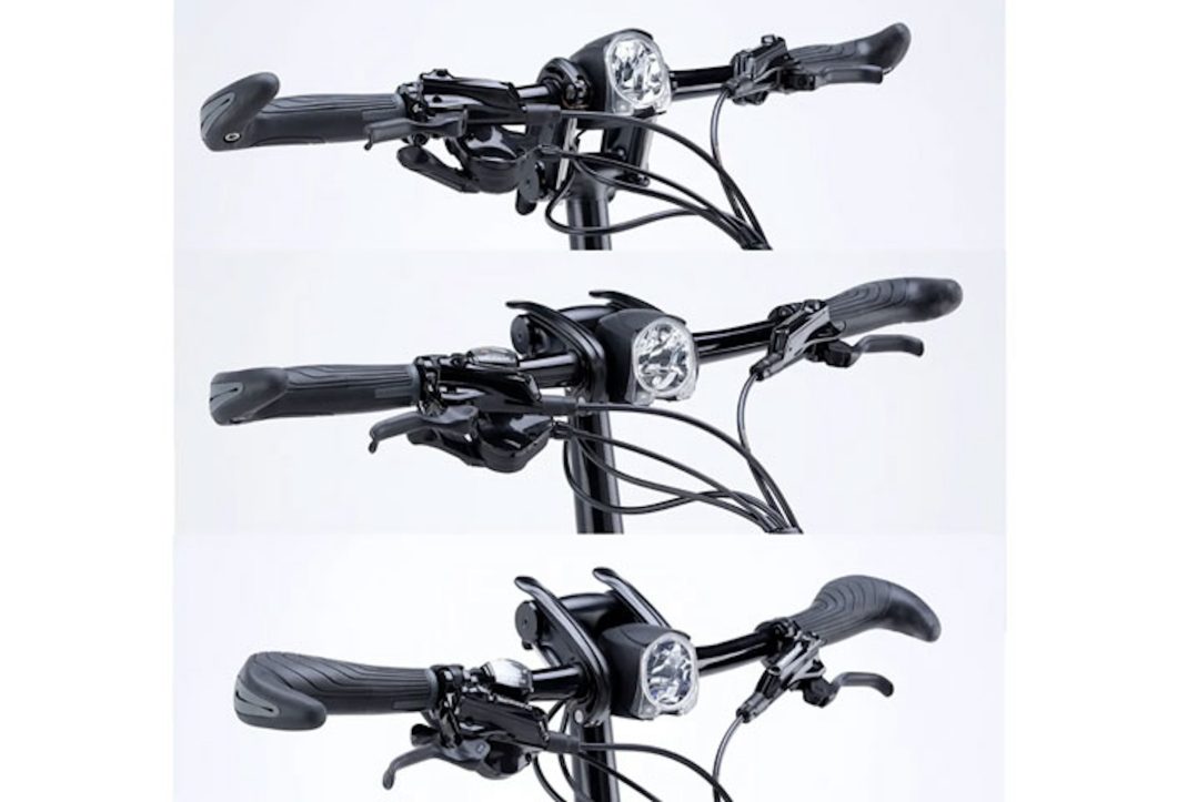 サーリーとかからもマルチポジションハンドルって出てるんですけど、このライトが付けられないんですよ。これは最初から付いてるものなんですけど、これがすごく明るくていいので、これ使いたいと。でもこれ、本体をハンドルが貫通している独特のデザインで。だからこのライトが付く前方部分のハンドルパイプ径が元のクランプ径と同じじゃなきゃいけないとか、いろんなサイズの問題が噴出して。ステムの規格も含めて、合う組み合わせが世の中にはまったくなかったんです。でも探しに探してようやくハンドルを見つけました。
