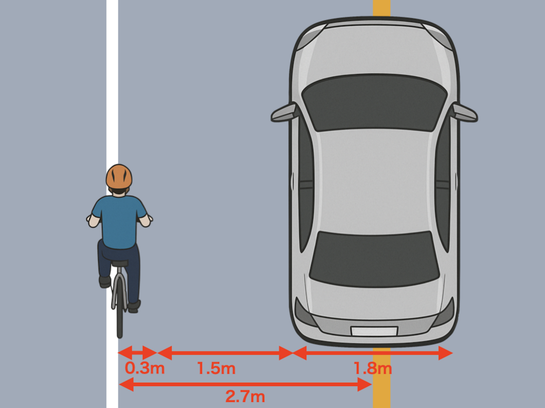 「1.5mという数値は、自転車利用者が車道通行に不安を抱く要因の一つである「側方間隔の不足」への対策として、条例の“安全な間隔”を具体化し、ドライバーが実践しやすい目安を示すことを目的として設定したものです。