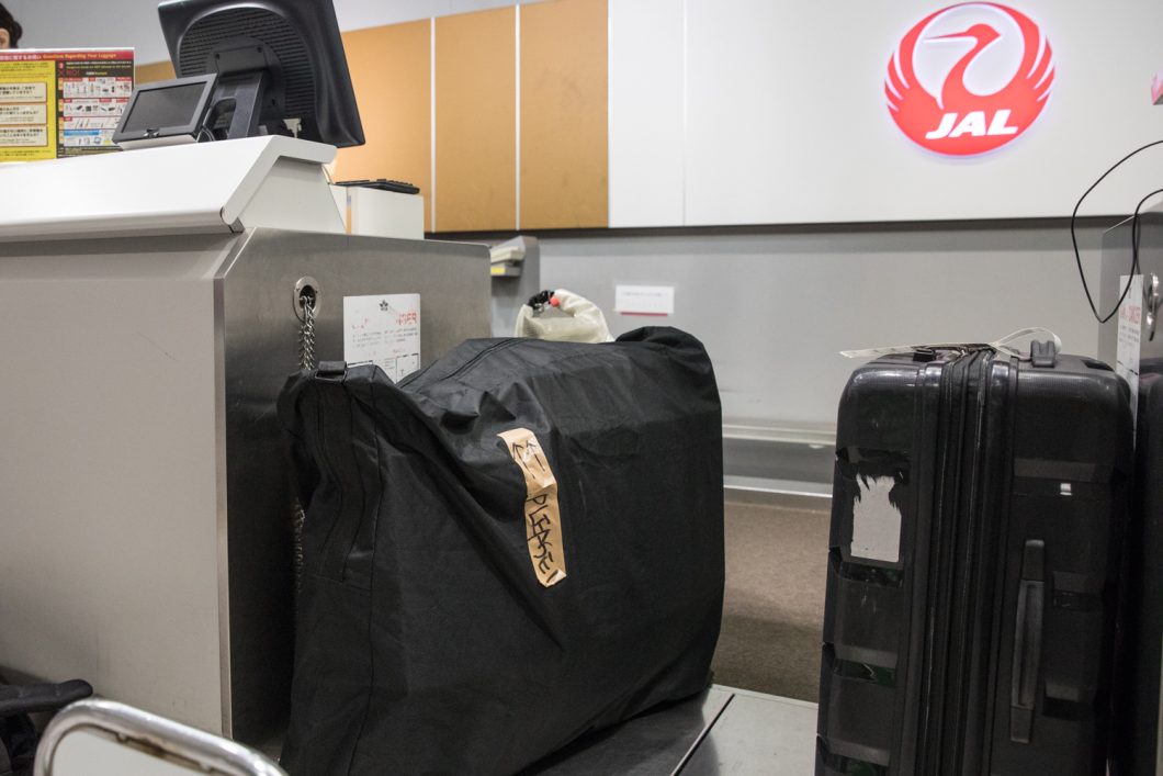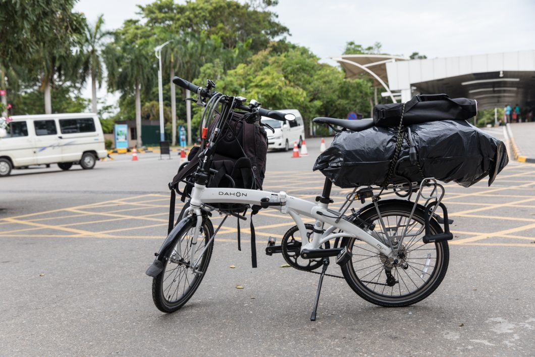 自転車で自走する時は荷物を自転車に積載するが、自転車を折り畳んで持ち運ぶ際にバッグが多いとその分移動が困難になる。そこでこの時は、リアラックにカヌーで使っていた筒型の防水バッグを載せることにした。衣類は、Tシャツやパンツ、靴下などは着用分と替えの計2枚。長ズボン1本、短パン1枚。防寒はレインウエアをウインドブレーカー代わりにする。石鹸は半分にカットしたもの。シャンプー、歯磨き粉は持たない。タオルもなし。薬などはすべて箱から出す。それらを防水バッグに入れてリアに積む。工具関係は、パンク修理道具、空気入れ、六角レンチ、結束バンドなど最小限のもの。ロック関係は2mのクリプトナイトにU字ロック。1.2m、60cmのワイヤーロックの計3本とした。