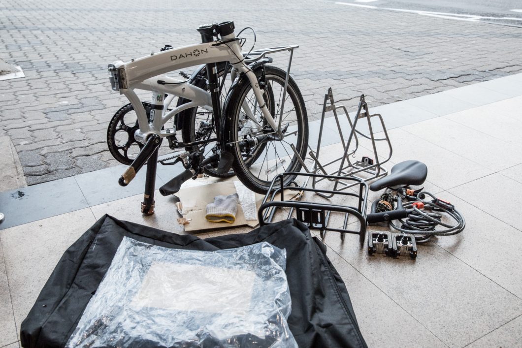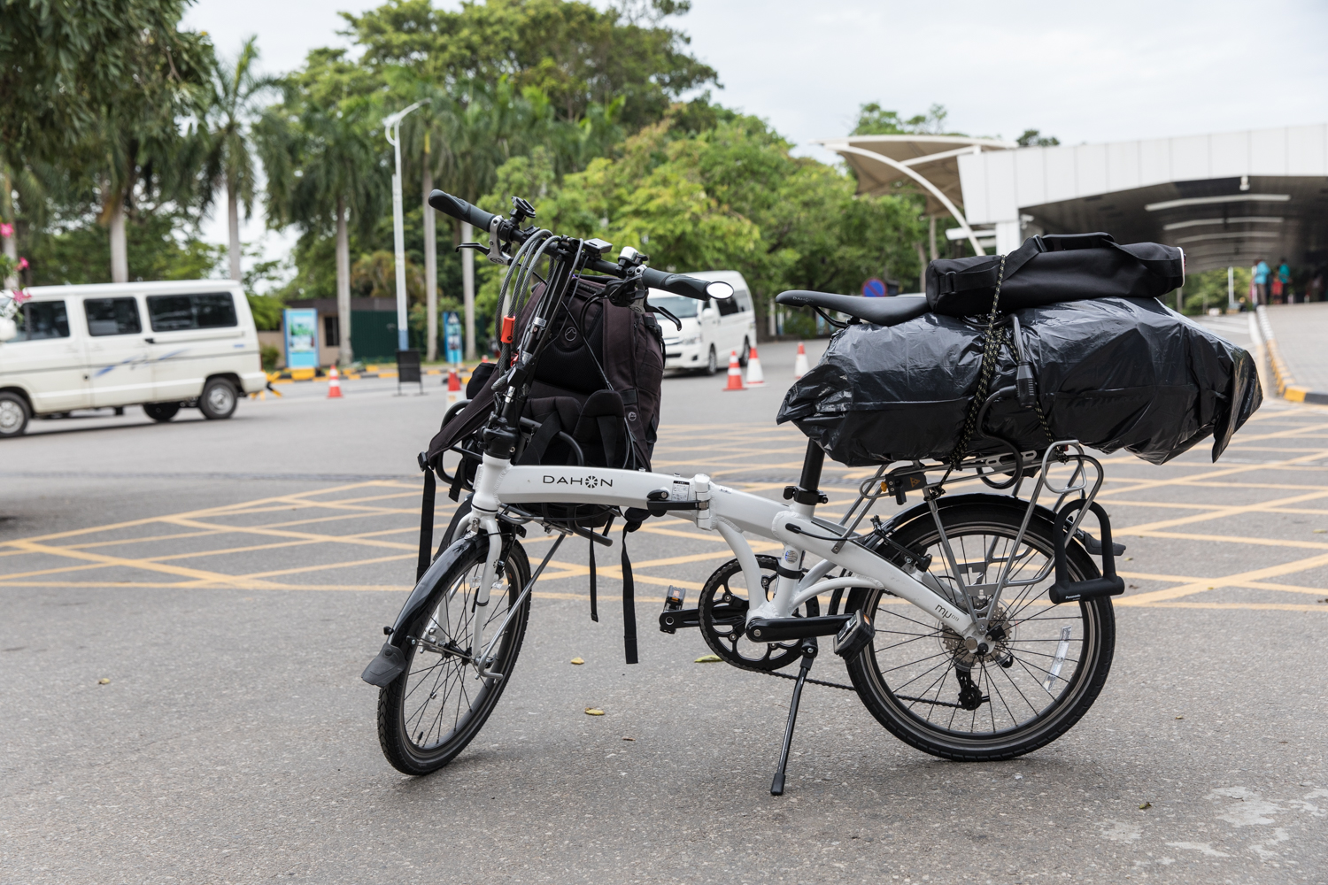 自転車はDAHONのMu D9をベースに、オプションパーツの前後ラック(Traveler Rack 20”)と泥除け(SKS Mudguards)を装着した。またその後試走をするなかでフロントに積むカメラバッグの座りが悪かったので、浅い前かごを追加している。DAHONは世界最大のフォールディングバイクブランドで、折り畳み自転車のパイオニアとしての歴史や膨大な特許数から、世界的シェア、ユーザー数を誇る。先進国ではレンタサイクルが普及している都市も多いが、利用できる場所や時間、車種には制限がある。そこで、車や公共交通機関を使って旅先に自分の自転車を持ち込む方法が取られ、簡単にコンパクトにできるフォールディングバイクが重宝されている。弓型フレームが特徴のMuシリーズは20インチサイズのロングセラーモデルで、誰でも直感的に扱える3ステップの折り畳み方法(DFS Technology)を採用している。