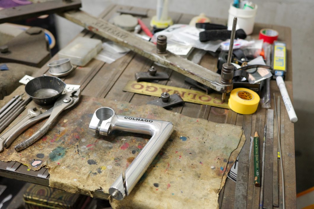 クロモリは丸パイプで細いので、ハンドルやステムも、こてっとしたものではなく、シンプルなものを組み合わせています。フレームの形も、ほぼ不変なので、あまり流行りものをつけすぎない。もちろんお客さんの好みもありますが、10年後でも20年後でも、置いてあって絵になる形を意識して提案しています。
